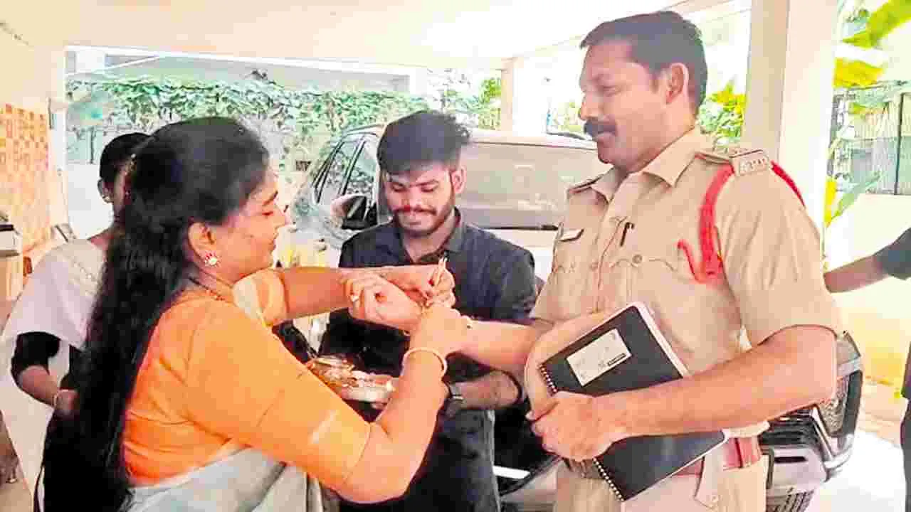 ఎంవీపీ కాలనీ(విశాఖపట్నం),ఆగస్టు 9(ఆంధ్రజ్యోతి): రక్షా బంధన్ సందర్భంగా పలువురికి రాష్ట్ర హోం మంత్రి వంగలపూడి అనిత రాఖీ కట్టారు.ఎంవీపీ కాలనీ నుంచి ఉషోదయ కూడలి వరకూ ఆటోలో ప్రయాణించి, ఆటో డ్రైవర్ యోగక్షేమాలు అడిగి తెలుసుకున్నారు.ఆటో డ్రైవర్ గిరీశ్కు రాఖీ కట్టారు.అనారోగ్యానికి గురైన ఉషోదయ కూడలి సమీపంలో ఉంటున్న కానిస్టేబుల్ కొర్లయ్యను పరామర్శించారు. అతడికి ధైర్యం చెప్పి రాఖీ కట్టారు.ఎంవీపీ కాలనీ స్టేషన్ సీఐ జె.మురళీ, ట్రాఫిక్ సీఐ ప్రసాద్,విధి నిర్వహణలో ఉన్న కొందరు పోలీసులకు అనిత రాఖీ కట్టారు.