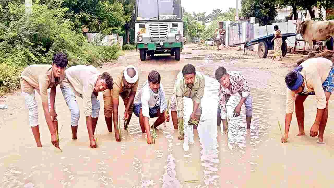 రోడ్డుపై మొక్కలు నాటి నిరసన