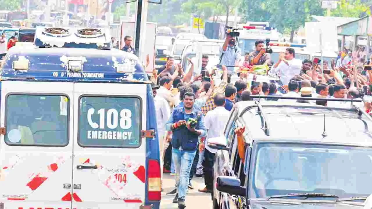 కారు పైనుంచి కార్యకర్తలకు అభివాదం చేయడంలో నిమగ్నమైన జగన్ నిలిచిపోయిన అంబులెన్స్ను పట్టించుకోలేదు. ఇక కొత్తూరు(అనకాపల్లి), కశింకోట, తాళ్లపాలెం జంక్షన్ వద్దకు స్థానిక వైసీపీ నేతలు భారీగా జనాన్ని తరలించారు. దీంతో కశింకోట నుంచి తాళ్లపాలెం వరకు జాతీయ రహదారిపై వందలాది వాహనాలు నిలిచిపోయాయి. తమ ఆదేశాలను ఉల్లంఘించి కాన్వాయ్తోనే వెళ్లేందుకు యత్నించినా, జగన్ వాహనాన్ని ఆపేందుకు నేతలు, కార్యకర్తలు రోడ్డుపైకి వచ్చినా పోలీసులు సహనంతోనే విధులు నిర్వర్తించారు.
