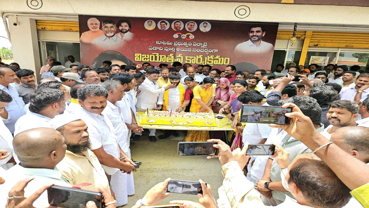 రైల్వేకోడూరు, జూన 12(ఆంధ్రజ్యోతి): ప్రజలు మెచ్చిన పాలనకు ఏడాది పూర్తయిందని టీడీపీ యువ నాయకుడు ముక్కా విశాల్రెడ్డి, ముక్కా సాయివికా్సరెడ్డి అన్నారు. కూట మి గెలుపును ప్రతి కార్యకర్తకు అంకితం చేస్తున్నామన్నారు. గురువారం రైల్వేకోడూరు మండలంలోని రాఘవరాజపురం వద్ద ఉన్న టీడీపీ కార్యాలయ ఆవరణం లో కేక్ కత్తిరించి సంబరాలు జరుపుకున్నారు. ఈ సం దర్భంగా వారు మాట్లాడుతూ ఎన్నికల్లో ప్రతికార్యకర్తా అంకితభావంతో పనిచేశారని గుర్తు చేశారు. వచ్చే నాలుగేళ్లలో మరిన్ని అభివృద్ధి కార్యక్రమాలు చేపతామన్నారు. రైల్వేకోడూరు నియోజకరవ్గంలోని అన్ని గ్రా మాలను అభివృద్ధి చేస్తామన్నారు. కార్యక్రమంలో నా యకులు బత్తిన వేణుగోపాల్రెడ్డి, మలిశెట్టి మురళీధర్గౌడు, కట్టా బాలాజీ పాల్గొన్నారు.