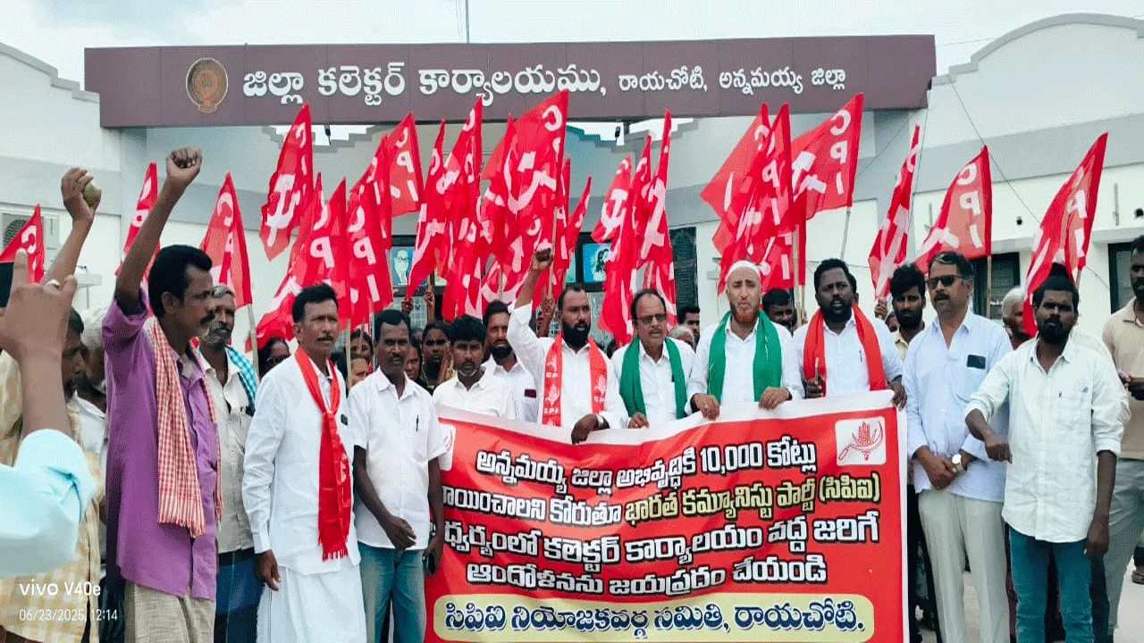 రాయచోటి(కలెక్టరేట్), జూన23(ఆంధ్రజ్యోతి): జిల్లా సమగ్ర అభివృద్ధికి రూ.10 వేల కోట్ల నిధులు కేటాయించాలని సోమవారం సీపీఐ ఆధ్వర్యంలో కలెక్టరేట్ ఎదుట ధర్నా చేపట్టారు.సీపీఐ జిల్లా కార్యదర్శి పీఎల్ నరసింహులు మాట్లాడుతూ అన్నమయ్య జిల్లా ఏర్పడి నాలుగు సంవత్సరాలు పూర్తయినా ఎటువంటి పురోగతి లేదన్నారు. పెండింగ్లో ఉన్న ప్రాజెక్టులను పూర్తి చేయాలన్నారు. సీపీఐ రాయచోటి నియోజకవర్గ కార్యదర్శి సిద్దిగాళ్ల శ్రీనివాసులు మాట్లాడుతూ రాయచోటి కేంద్రంలో కోల్డ్ స్టోరేజ్లు ఏర్పాటు చేసి పంటలకు గిట్టుబాటు ధర వచ్చేలా కృషి చేయాలన్నారు. ఈ కార్యక్రమంలో సీపీఐ పీలేరు నియోజకవర్గ కార్యదర్శి టీఎల్ వెంకటేశ, ఆంధ్రప్రదేశ రైతు సంఘం జిల్లా కార్యదర్శి వంగిమళ్ల రంగారెడ్డి, సీపీఐ పట్టణ కార్యదర్శి జగనబాబు, రైతు సంఘం నియోకజకవర్గ అధ్యక్షుడు హరినాథనాయుడు, అంజాబ్అలీఖాన, నాయకులు తదితరులు పాల్గొన్నారు.