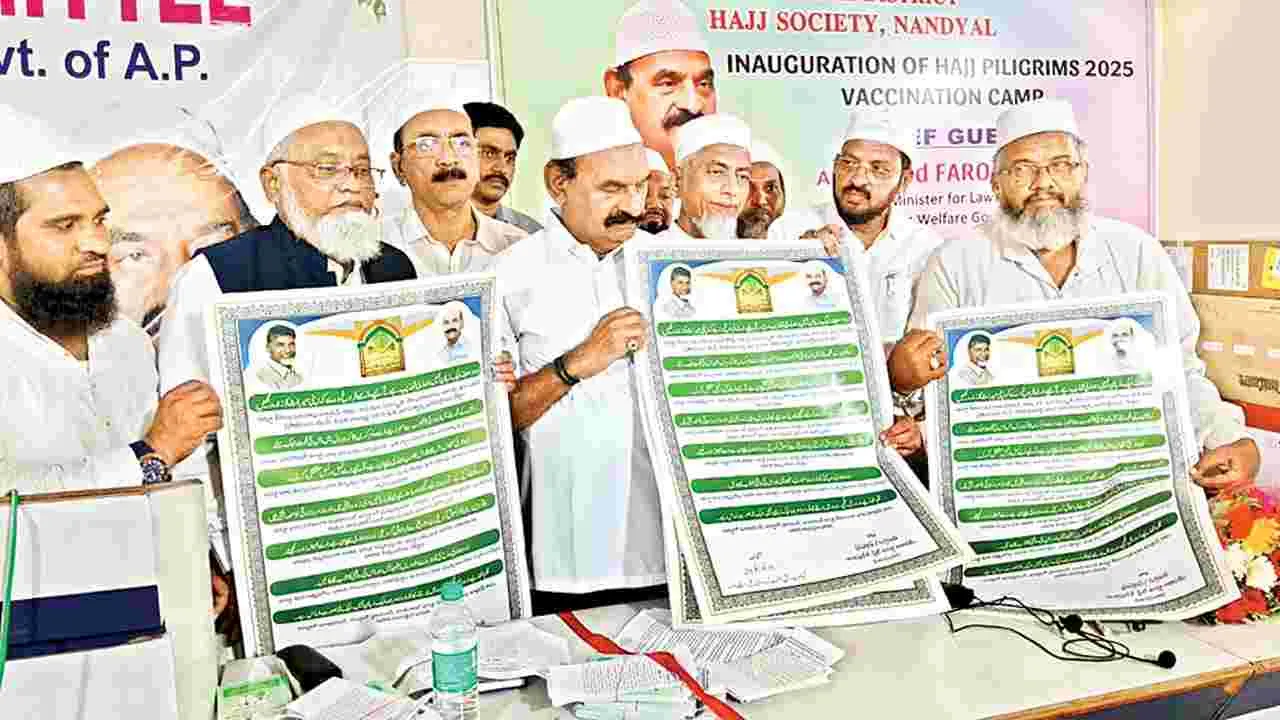 నంద్యాల ఎడ్యుకేషన్, ఏప్రిల్ 17 (ఆంధ్రజ్యోతి): హజ్ యాత్రకు రాష్ట్రం నుంచి 1,630 మంది యాత్రికులు వెళ్తున్నారని, వారికి రాష్ట్ర ప్రభుత్వం తరపున అన్ని వసతులు ఏర్పాటు చేసినట్లు న్యాయ, మైనార్టీ సంక్షేమ శాఖ మంత్రి ఎన్ఎండీ ఫరూక్ పేర్కొన్నారు. గురువారం నంద్యాల నేషనల్ పీజీ కళాశాలలో జిల్లా హజ్ కమిటీ అధ్యక్షుడు డాక్టర్ ఇంతియాజ్ అహ్మద్ ఆధ్వర్యంలో హజ్ యాత్రికులకు వ్యాక్సినేషన్, బ్యాగుల పంపిణీ కార్యక్రమానికి మంత్రి హాజరయ్యారు. ఈ సందర్భంగా మంత్రి ఫరూక్ మాట్లాడుతూ హజ్ యాత్రికులకు హైదరాబాద్, బెంగుళూరు ఎంబార్కేషన్ సెంటర్ల నుంచి వివిధ దశల్లో హజ్కు వెళ్తారన్నారు.