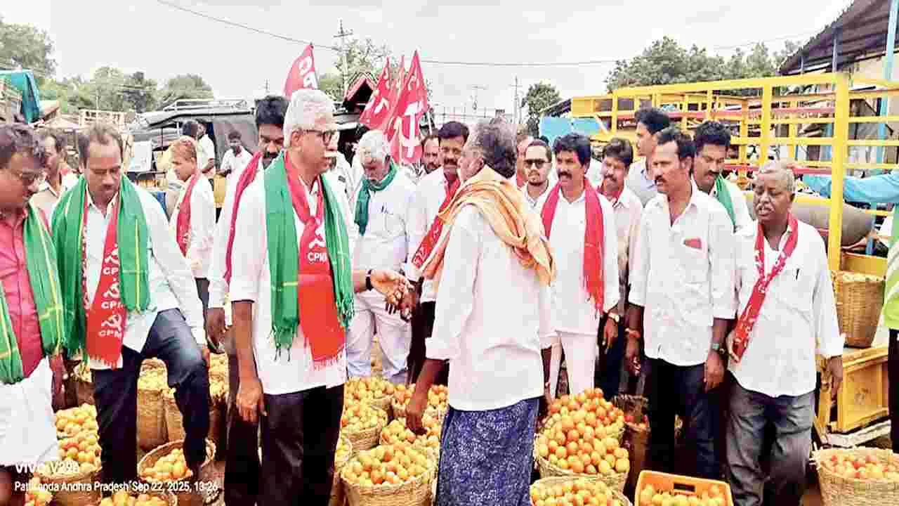 పత్తికొండ టౌన్, సెప్టెంబరు 22 (ఆంధ్రజ్యోతి): పత్తికొండ నియోజకవర్గంలో టమోటా జ్యూస్ ఫ్యాక్టరీ ఏర్పాటు చేయడం ద్వారా రైతులను ఆదుకోవచ్చని సీపీఎం రాష్ట్ర కార్యదర్శి శ్రీనివాసరావు అన్నారు. సోమవారం శ్రీనివాసరావుతో పాటు సీపీఎం, రైతు సంఘాల బృందం నాయకులు పత్తికొండ టమోటా మార్కెట్ను సందర్శించారు. అక్కడ టమోటా ధరలపై రైతులను బృందం నాయకులు అడిగి తెలుసు కున్నారు. ఈ సందర్భంగా వేలకు వేలు పెట్టుబడులు పెట్టి పంటలను సాగుచేస్తే సరైన ధర లేక తీవ్ర నష్టాలను చవిచూడాల్సి వస్తోందని పలువురు టమోటా రైతులు బృందం నాయకులకు రైతులు గోడును వివరించారు. శ్రీనివాసరావు మాట్లాడుతూ వ్యాపారుల సిండికేట్తో టమో టా రైతులకు తీరని అన్యాయం జరుగుతోందన్నారు. రైతులను ఆదు కుంటామని, మద్దతు ధర ఇస్తామని కేంద్ర, రాష్ట్ర ప్రభుత్వాలు ప్రగ ల్భాలు పలుకుతున్నప్పటికీ పంటలు చేతికొచ్చే సమయంలో ధరలు పత నమై తీవ్రంగా నష్టపోతున్నారని అన్నారు. పత్తికొండ టమోటా మార్కె ట్లో తీసుకొచ్చిన టమోటాలు నాణ్యతపరంగా ఉన్నాయని, అయితే హైదరాబాద్లో కిలో టమోటా రూ.50 ధర పలికితే పత్తికొండ మా ర్కెట్లో కిలో రూ.5 కూడా కొనుగోలు చేయని పరిస్థితి నెలకొందని అన్నా రు. మార్క్ఫెడ్ అధికారులు పర్యవేక్షించి టమోటాకు గిట్టుబాటు ధర కల్పించేలా చొరవ చూపాలన్నారు. కిలో టమోటాను రూ.25 చొప్పున కొనుగోలు చేసేలా చర్యలు తీసుకోవాలన్నారు. కార్యక్రమంలో సీపీఎం జిల్లా కార్యదర్శి గౌస్దేశాయ్, రైతు సంఘం జిల్లా అధ్యక్షుడు రామకృష్ణ, సీపీఎం మండల కార్యదర్శి వెంకటేశ్వరరెడ్డి, నాయకులు రంగారెడ్డి, రవిచంద్ర వీరశేఖర్, సిద్ధయ్యగౌడ్ తదితరులు పాల్గొన్నారు.