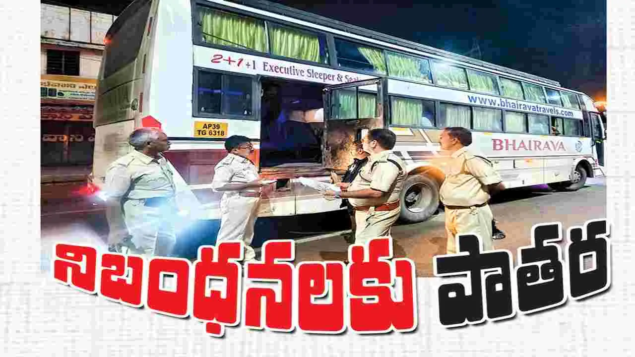 ఇటీవల వేమూరి ట్రావెల్స్ బస్సు ప్రమాద ఘటనతో అసలు ఈ ట్రావెల్ బస్సుల యాజమాన్యం ఎలాంటి నిబంధనలు పాటిస్తున్నాయి? అనే కోణంలో ఆరా తీస్తున్నారు. ప్రయాణికుల ఒకటో, రెండో లగేజీ బ్యాగులు తీసుకెళ్లాల్సిన ట్రావెల్స్ బస్సులు మొత్తం వాణిజ్య సరుకులనే సరఫరా చేస్తున్నాయి. ప్రయాణికుల టికెట్తో వచ్చే లాభం కంటే ఈ రవాణా వల్ల వచ్చే లాభం అధికంగా ఉంటుంది. బస్సు కింద ఉండే ట్రావెల్లో పైన ఉన్న ప్రయాణికుల కంటే ఎక్కువ లోడ్ వేస్తున్నారు. వీటిలో అగ్ని మాపక శాఖ పరికరాలు కానీ, ఎమర్జెన్సీ డోర్లు కానీ ఉండటం లేదు. దీనికి తోడు అత్యవసర సమయాల్లో అద్దాలు పగలకొట్టేందుకు ఉండాల్సిన చిన్నపాటి సుత్తెలు కూడా అందుబాటులో ఉండటం లేదని గుర్తించారు. ఈ ట్రావెల్ బస్సులన్నీ టూరిస్టు బస్సులుగా రిజిస్ర్టేషన్ చేసుకుంటారు. కాంట్రాక్టు క్యారేజ్ మాత్రమే తీసుకెళ్లాలి. అంటే ఓ సమూహ ప్రయాణికులను ఓ ప్రదేశం నుంచి మరో ప్రదేశానికి తీసుకెళ్లేందుకు అనుమతులు ఉంటుంది. అయితే వ్యక్తిగత టికెట్లు మాత్రమే వసూలు చేస్తున్నారు.