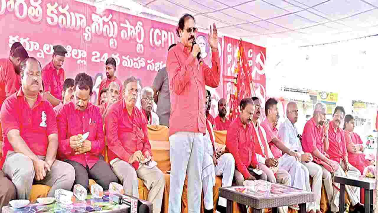 కర్నూలు న్యూసిటీ, ఆగస్టు 9(ఆంధ్రజ్యోతి): రాష్ట్రంలో లంచగొండి రాజ్యం నడుస్తోందని సీపీఐ రాష్ట్ర కార్యదర్శి కె.రామకృష్ణ ఆరోపించారు. శనివారం నగరంలోని పాతబస్టాండు అంబేడ్కర్ విగ్రహం వద్ద సీపీఐ జిల్లా 24వ మహాసభలను అంగరంగ వైభవంగా నిర్వహించారు. ముందుగా జిల్లా పరిషత్ నుంచి కళాకారులు, నాయకులు, కార్యకర్తలతో భారీ ఊరేగింపుగా పాతబస్టాండు వరకు ర్యాలీ నిర్వహించారు. నగరం అంతా ఎర్రజెండాలతో రెపరెపలాడింది. మహాసభలకు జిల్లా కార్యదర్శి బి.గిడ్డయ్య అధ్యక్షత వహించగా ముఖ్యఅతిథులుగా రాష్ట్ర కార్యదర్శి రామకృష్ణ, సహాయ కార్యదర్శి నాగేశ్వరరావు, రాష్ట్ర కార్యదర్శివర్గసభ్యులు పి.రామచంద్రయ్య, జగదీశ్, రాష్ట్ర కార్యవర్గసభ్యులు కె.రామాంజనేయులు, ఆవుల శేఖర్, లెనిన్బాబు హాజరయ్యారు. ఈ సందర్భంగా రామకృష్ణ మాట్లాడుతూ రాష్ట్రంలో 1.47లక్షల రేషన్కార్డులు ఉన్నాయని, కూటమి ఎమ్మెల్యే బియ్యం అమ్ముకోవడానికి అంగళ్లు తెరిచారని విమర్శించారు. జిల్లాలో పెండింగ్ ప్రాజెక్టులు పూర్తి చేయాలని, జిల్లా సమగ్రాభివృద్ధికి రూ.20వేల కోట్లు నిధులు కేటాయించాలని డిమాండ్ చేశారు. టీడీపీ-జనసేన పార్టీ నాయకులు రాష్ట్రంలో సుపరిపాలన జరుగుతుందని ప్రచారాలు చేస్తున్నారని, లంచం లేకుండా ఎక్కడ ఏ కార్యాలయంలో పని జరగడం లేదన్న విషయం పాలకులు తెలుసుకోవాలన్నారు. రాష్ట్రంలో ఎన్నడూ, ఎవరూ చేయని విధంగా కూటమి ప్రభుత్వం ఏడాది పాలనలో రూ.1,75,000 వేల కోట్లు అప్పులు చేసిందన్నారు. ఇదే నెలలో రాష్ట్ర మహాసభలు, సెప్టెంబర్లో జాతీయ మహాసభలు చండీఘర్లో నిర్వహిస్తున్నామన్నారు. కళాకారులు ఆలపించిన గేయాలు, నృత్యాలు పలువురిని ఆకర్షించాయి. వివిద ప్రాంతాల్లోని స్థూపాల నుంచి తీసుకువచ్చిన అరుణ పతాకాలను అతిఽథులకు అందజేశారు. అమరవీరులకు జోహర్లు అర్పించారు. కార్యక్రమంలో మహాసభల ఆహ్వాన సంఘం అధ్యక్షుడు కె.జగన్నాథం, సలహాదారుడు భీమలింగప్ప, జే.లలితమ్మ, జిల్లా సహాయ కార్యదర్శి ఎస్.మునెప్ప, నంద్యాల జిల్లా కార్యదర్శి రంగనాయుడు, మహిళా సమాఖ్య జిల్లా కార్యదర్శి శ్రావణిరెడ్డి, రామకృష్ణారెడ్డి, అజయ్బాబు, ఏఐఎ్సఎఫ్ జిల్లా కార్యదర్శి శ్రీనివాసులు, రబిరసూల్, పంపన్నగౌడు పాల్గొన్నారు.