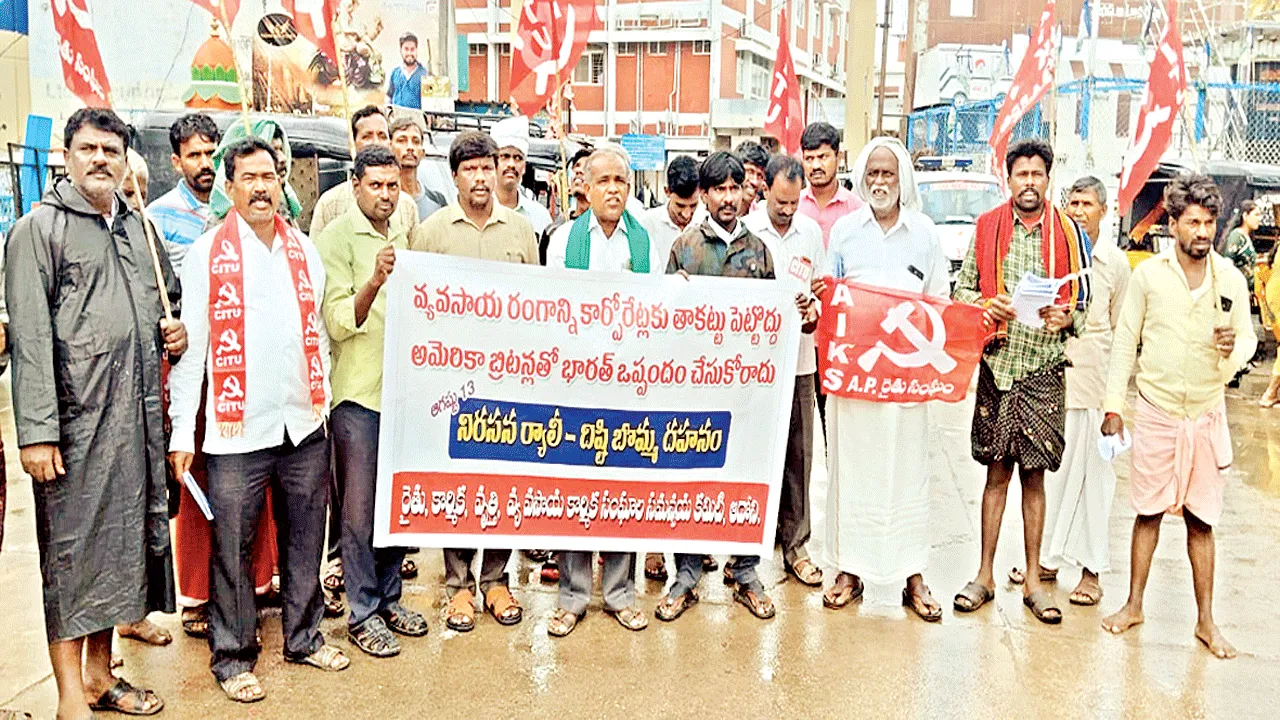 ఆదోని అగ్రికల్చర్, ఆగస్టు 13 (ఆంధ్రజ్యోతి): అమెరికా, బ్రిటన్ దేశాలతో చేసుకున్న విదేశీ వాణిజ్య ఒప్పందాలను రద్దుచేయాలని రైతు సంఘం జిల్లా అధ్యక్షుడు కె.వెంకటేశులు డిమాండ్ చేశారు. దేశవ్యాప్త సంయుక్త కిసాన్ మోర్చా పిలుపు మేరకు బుధవారం పట్టణంలో రైతు, కార్మిక, ప్రజా సంఘాల ఆధ్వర్యంలో నిరసన తెలిపారు. పీఎం మోదీ అమెరికా ఎగుమతి దిగుమతి షరతులను అంగీకరించడం సరికాదన్నారు. ఇప్పటికే దేశంలో వ్యవసాయం గిట్టుబాటు కాక చిన్న, సన్నకారు, కౌలు రైతులు ఆత్మహత్యలు చేసుకుంటున్నారని ఆందోళన వ్యక్తం చేశారు. తక్షణమే రైతుల అప్పులను మాఫీ చేసి పంట ఉత్పత్తులకు కనీస మద్దతు ధర చట్టాన్ని చేయాలని డిమాండ్ చేశారు. క్విట్ ఇండియా స్పూర్తితో రైతాంగం ఉద్యమించాలని పిలుపునిచ్చారు. రామాంజనేయులు, గోపాల్, తిప్పన, లక్ష్మణ్, రంగస్వామి, బాషా పాల్గొన్నారు.