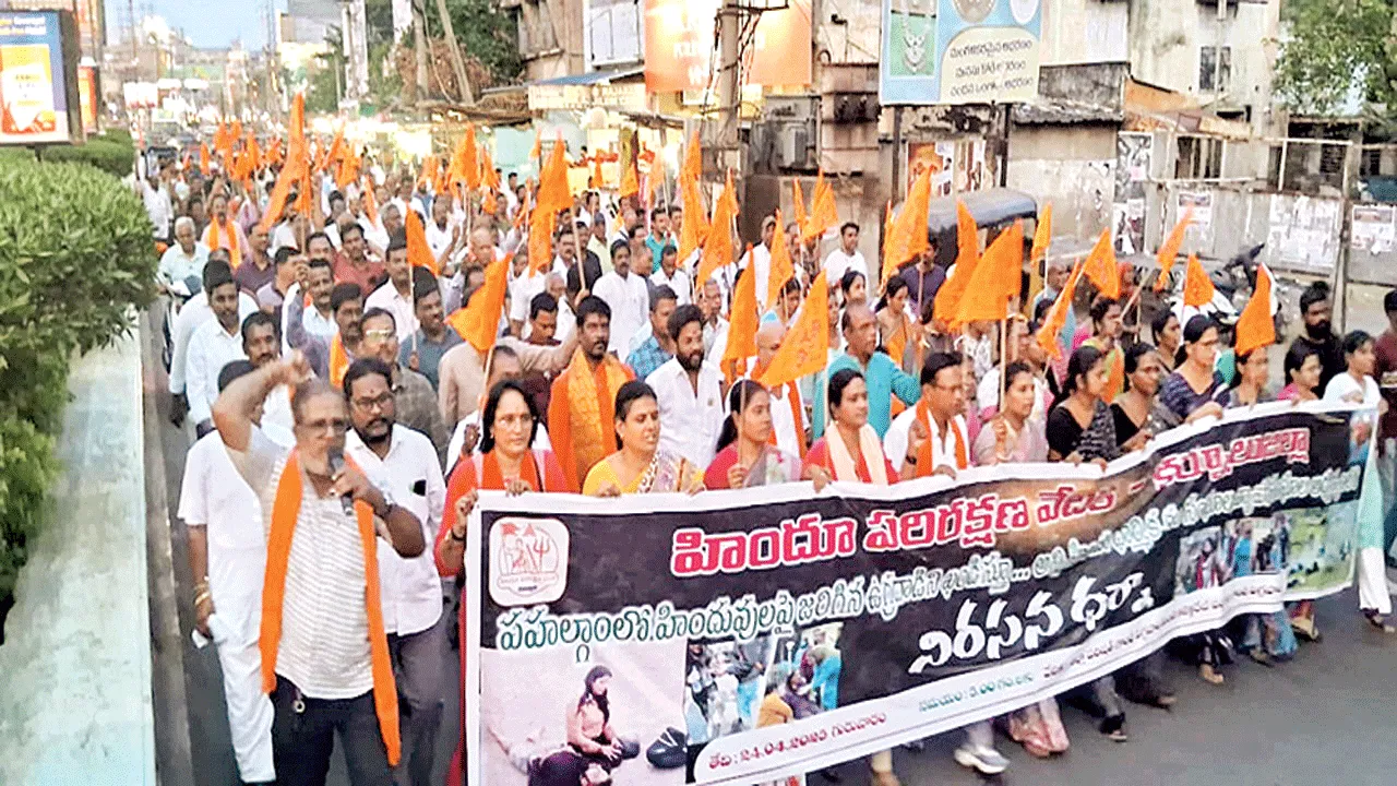 కర్నూలు కల్చరల్, ఏప్రిల్ 24 (ఆంధ్రజ్యోతి): ఉగ్రవాదులకు ఊతమిస్తున్న పాకిస్తాన్పై యుద్ధం ప్రకటించాలని హిందూ పరిరక్షణ వేదిక నాయకులు డిమాండ్ చేశారు. కశ్మీర్లోని ఫెల్గావ్లో హిందువులపై జరిగిన నరమేధాన్ని తీవ్రంగా నిరసిస్తూ వీహెచ్పీ, అనుబంధ సంఘాలు హిందూ పరిరక్షణ వేదిక ఆధ్వర్యంలో కర్నూలు నగరంలో భారీ నిరసన శాంతి ర్యాలీ నిర్వహించారు. నగరంలోని జడ్పీ కార్యాలయం ఎదుట మహాత్ముడి విగ్రహం వద్ద కొవ్వొత్తులు వెలిగించి, ఉగ్రవాదులకు బలి అయిన వారికి శ్రద్ధాంజలి ఘటించారు. అనంతరం కలెక్టరేట్ వరకు ర్యాలీ నిర్వహించి అక్కడ మహాత్ముడి విగ్రహం ఎదుట నివాళులర్పించారు. ఈ సందర్భంగా వక్తలు మాట్లాడుతూ ఫెల్గావ్లో జరిగిన ఉగ్రమూకల దాడి హృదయ విదారకంగా ఉందని, ఉగ్రమూకలు ఆధార్ కార్డులు వెతికి, కల్మా చదవమని, చదవని వారిని దారుణంగా తుపాకులతో కాల్చి చంపడం హేయమైన చర్య అని అన్నారు. ఈ నరమేధం వెనుక అనేక కుట్ర కోణాలు ఉన్నాయని, ఇది రాబోయే రోజుల్లో అమర్నాథ్ యాత్రకు వచ్చే యాత్రికులను భయపడేలా చేయడమేనన్నారు. కశ్మీర్లో పెట్టుబడులు ఆపడం, పర్యాటకులను రాకుండా అడ్డుకోవడం, హిందూ భూములకు, ఆస్తులకు భద్రత లేదనే భావన కల్పించేందుకే పాక్మూకలు ఈ దాడులకు తెగబడ్డాయన్నారు. ఈ కార్యక్రమంలో వీహెచ్పీ రాష్ట్ర మీడియా కన్వీనర్ మాళిగి భానుప్రకాశ్, వీహెచ్పీ రాష్ట్ర నాయకుడు టి. ప్రతాపరెడ్డి, జిల్లా అధ్యక్షుడు టీసీ మద్దిలేటి, జిల్లా కార్యదర్శి ఈపూరి నాగరాజు, ఆర్ఎ్సఎస్ నాయకుడు రామకృష్ణ, బీజేపీ నాయకులు రంగస్వామి, కాశీ విశ్వనాథ్, ఏబీవీపీ జాతీయ కార్యదర్శి డాక్టర్ ఎం. నాగఫణిశాస్త్రి, ఆపస్ సత్యనారాయణ, కళ్లే చంద్రశేఖర్ శర్మ, రాజేశ్ శర్మ, మహిళా విభాగాల ప్రతినిధులు వరలక్ష్మి, దేవకీదేవిలతోపాటూ వివిధ ధార్మిక, ఆథ్యాత్మిక సంస్థల ప్రతినిధులు, కుల సంఘాల నాయకులు పాల్గొన్నారు.