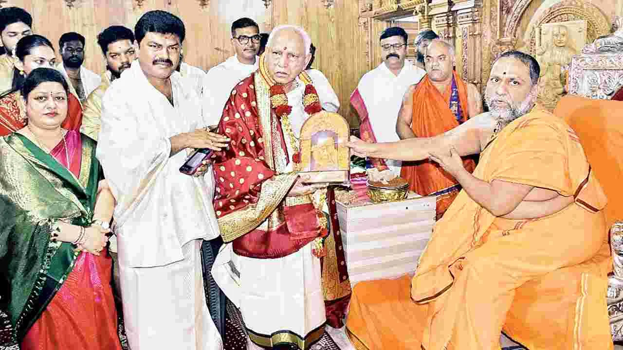 మంత్రాలయం, మే 1(ఆంధ్రజ్యోతి): మంత్రాలయం రాఘవేంద్ర స్వామి దర్శనార్థం కర్ణాటక మాజీ ముఖ్యమంత్రి బీఎస్ యడ్యూరప్ప, కుమారుడు శివమొగ్గ ఎంపీ రాఘవేంద్ర కుటుంబ సమేతంగా గురువారం రాఘవేంద్రస్వామిని దర్శించుకున్నారు. బుధవారం రాత్రి మంత్రాలయంకు వచ్చి పద్మనాభతీర్థ గెస్ట్ హౌస్లో బసచేశారు. మహా ముఖద్వారం వద్ద వీరికి మఠం ఏఏవో మాధవశెట్టి, మేనేజర్లు సురేష్ కోణాపూర్, వెంటేష్ జోషి, శ్రీపతి ఆచార్, ఐపీ నరసింహామూర్తి, సీఐ రామాంజులు, ఎస్ఐ శివాంజల్ ఘనంగా స్వాగతం పలికారు. గ్రామదేవత మంచాలమ్మను దర్శించుకుని రాఘవేంద్రస్వామి మూల బృందావనానికి విశేష పూజలు చేశారు. అనంతరం మఠం పీఠాధిపతి సుబుధేంద్ర తీర్థులు మెమెంటో, శేషవస్త్రం, ఫల, పుష్ప, మంత్రాక్షితలు, పరిమళ ప్రసాదం ఇచ్చి ఆశీర్వదించారు. తన మనవడి వివాహానికి రావాలని పీఠాధిపతిని ఆహ్వానించారు. సూపరింటెండెంట్ అనంతపురాణిక్, విజయేంద్రాచార్, వ్యాసరాజాచార్, రాఘవేంద్రపురాణిక్, నరసింహదేశాయ్, ద్వారపాలక అనంతస్వామి, తంబిస్వామి, వాజేంద్రాచార్, రాఘవేంద్రాచార్, పవన్ఆచార్, రంగస్వామి, వరధేంద్రాచార్ తదితరులు పాల్గొన్నారు.