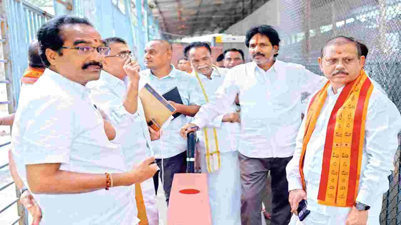 నంద్యాల కల్చరల్, జూన్ 24(ఆంధ్రజ్యోతి): ప్రముఖ జ్యోతిర్లింగ క్షేత్రమైన శ్రీశైలంలో జూలై ఒకటో తేదీ నుంచి వారంలో నాలుగురోజుల పాటు స్వామివారి స్పర్శ దర్శనం కల్పిస్తున్నట్లు ఆలయ ఈవో శ్రీనివాసరావు తెలిపారు. మంగళవారం నుంచి శుక్రవారం వరకు మధ్యాహ్నం 1:45 నుంచి 3:45 నిమిషాల వరకు ఉచిత స్పర్శదర్శనాన్ని కల్పిస్తామన్నారు. భక్తులు ఏ రోజుకారోజు ఉచిత స్పర్శదర్శనం టోకన్లు పొందాల్సి ఉంటుందన్నారు. ఈ సందర్భంగా ఆలయ ఈవో ఉచితస్పర్శదర్శన క్యూలైన్లు, అన్న ప్రసాద కేంద్రం, తదితర విభాగాలను మంగళవారం పరిశీలించి ఉద్యోగులకు పలు సూచనలు చేశారు.