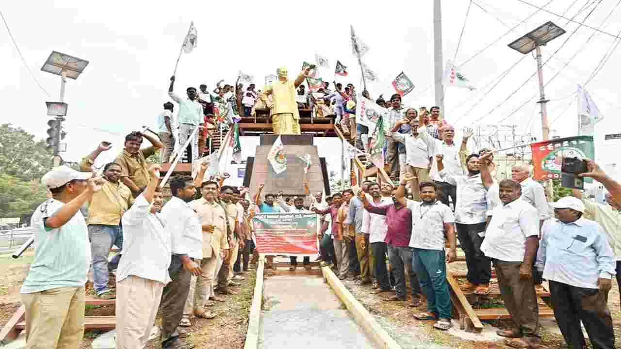 కర్నూలు న్యూసిటీ, జూన్ 24 (ఆంధ్రజ్యోతి): తమ న్యాయమైన డిమాండ్లను నెరవేర్చకపోతే భార్యాపిల్లలతో సహా ఆమరణ నిరాహారదీక్షకు పూనుకుంటామని ఏపీ మున్సిపల్ ఇంజనీరింగ్ కార్మికుల యూనియన్ రాష్ట్ర కోశాధికారి సమీర్బాషా స్పష్టం చేశారు. మున్సిపల్ ఇంజనీరింగ్ కార్మికుల జీతాల పెంపుదల సమ్మె మంగళవారం 49వ రోజుకు చేరు కుంది. ఈ సందర్భంగా ఆయన మాట్లాడుతూ ప్రభుత్వం ఇప్పటి వరకు స్పందించకపోవడం శోచనీయమన్నారు. కూటమి ప్రభుత్వం కార్మికుల విషయంలో నిర్లక్ష్యం వహిస్తుందని అన్నారు. ప్రభుత్వ ఉద్యోగులని ఆన్లైన్లో చూపిస్తూ ‘తల్లికి వందనం’ పథకం డబ్బులు తల్లుల ఖాతాల్లో పడలేదని ఆవేదన వ్యక్తంచేశారు. ఈమేరకు తల్లికి వందనం పడని పిల్లలు, తల్లిదండ్రుల సహా మున్సిపల్ కార్యాలయం నుంచి కలెక్టరేట్ వరకు వెళ్లి అక్కడ ఎన్టీఆర్ విగ్రహానికి సమర్పించారు. ఈ ర్యాలీలో నగర పాలక పంప్ హౌస్లో, వీధిదీపాల, పార్కులు, డివైడర్లలో పనిచేసే కార్మి కులు, వారి పిల్లలు భారీ సంఖ్యలో పాల్గొన్నారు.