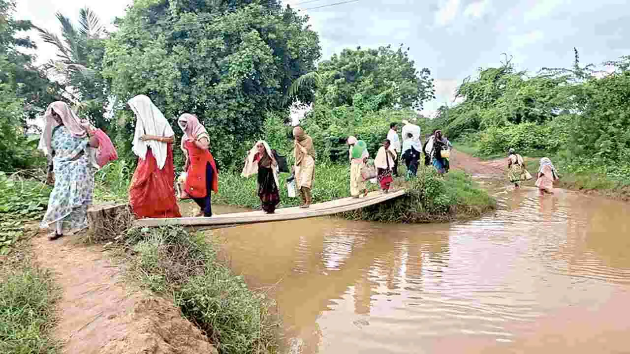 అడుగులో అడుగువేస్తూ ఎక్కడ పడిపోతామో అనుకుంటూ అనుక్షణం భయం భయంగా వస్తున్న వీరు నిత్యం ఇలా సాహసం చేస్తేనే గమ్యస్థానాలకు చేరుకోగలరు. చాగలమర్రి మండలంలోని గోపాయపల్లె రహదారి వద్దగల అడ్డవాగును ప్రజలు దాటాలంటే ఇలా సర్కస్ ఫీట్లు చేయక తప్పదు. వాగు సమీపంలో 2,500 ఎకరాల్లో కంది, మినుము, మొక్కజొన్న, మల్లెతోటలు ఉన్నాయి. ఈ పంట పొలాలను నమ్ముకొని సుమారు 500 మంది రైతులు, కూలీలు జీవిస్తున్నారు. వర్షపు నీరు, టీజీపీ లీకేజీ నీరు కలిసి అడ్డవాగుకు చేరడంతో రైతులు, కూలీలు వాగు దాటేందుకు ఇబ్బందులు పడుతున్నారు. అడ్డవాగుపై వంతెన లేకపోవడంతో ఇలా వాగుపై మూడు విద్యుత్ స్తంభాలను అడ్డుగా వేసి దాటుకుంటూ వెళ్తున్నారు.
