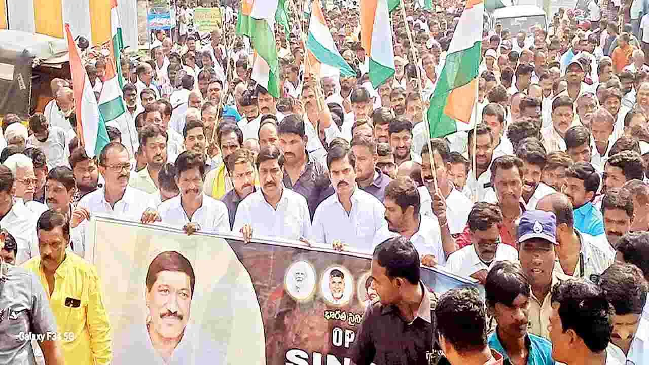 కొలిమిగుండ్ల, మే 17 (ఆంధ్రజ్యోతి): మనదేశంపై ఉగ్రమూకలను ఉసిగొల్పిన పాకిస్థాన్కు భారత ప్రభుత్వం గట్టి గుణపాఠం చెప్పిందని రాష్ట్ర ఆర్అండ్బీ శాఖ మంత్రి బీసీ జనార్దన్రెడ్డి పేర్కొన్నారు. ‘ఆపరేషన్ సిందూర్’ విజయవంతమైన నేపథ్యంలో భారత సైనికులకు సంఘీభావంగా శనివారం కొలిమిగుండ్లలో నిర్వహించిన తిరంగా ర్యాలీలో మంత్రి పాల్గొన్నారు. మొదట హైస్కూల్ ఆవరణలో మొక్కలు నాటారు. అనంతరం ర్యాలీని ప్రారంభించారు. జడ్పీహెచ్ఎస్ నుంచి పోలీస్స్టేషన్, బ్యాంకు మీదుగా, ఆర్టీసీ బస్టాండు వరకు ర్యాలీలో పాల్గొన్నారు. అనంతరం జరిగిన సభలో మంత్రి బీసీ మాట్లాడారు. ప్రధాని నరేంద్రమోదీ నాయకత్వంలో భారత్ అత్యంత శక్తివంతమైన దేశంగా ఎదిగిందన్నారు. ఇండియా జోలికొస్తే ఏం జరుగుతుందో పాకిస్థాన్కు మన సైనికులు రుచి చూపించారని అన్నారు. ‘ఆపరేషన్ సిందూర్’లో మురళీనాయక్ వీరమరణం పొందడం బాధాకమని అన్నారు. కార్యక్రమంలో టీడీపీ నాయకులు మూలే రామేశ్వరరెడ్డి, వీఆర్ లక్ష్మీరెడ్డి, నంద్యాల రామేశ్వరరెడ్డి, అంబటి జయలక్ష్మీరెడ్డి, గొంగటి హుస్సేన్రెడ్డి, ప్రసాదు, నరసింహుడు, కామిని క్రిష్ణరంగారెడ్డి, కత్తి రాందాస్, శివరామిరెడ్డి పాల్గొన్నారు.
