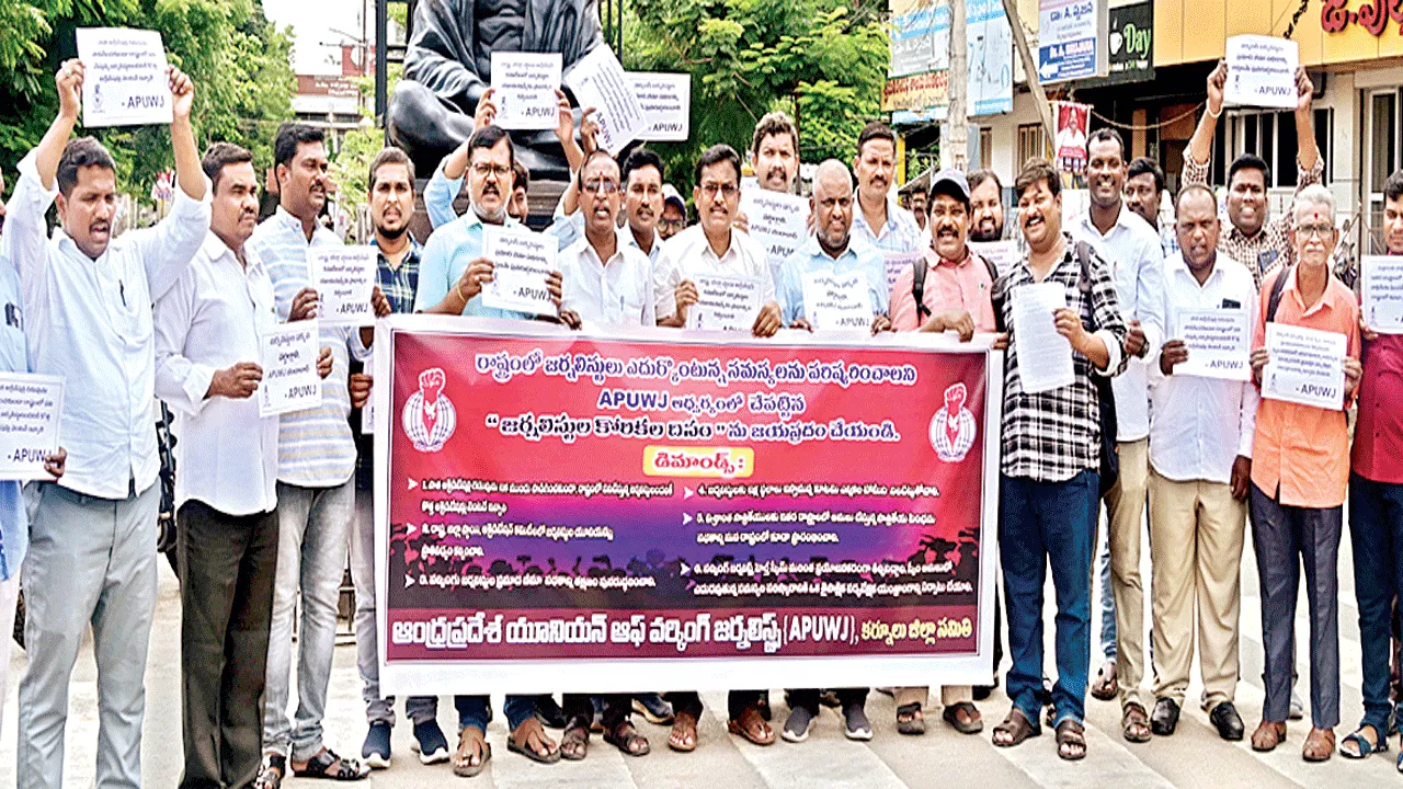 కర్నూలు కల్చరల్, ఆగస్టు 5(ఆంధ్రజ్యోతి): మూడు నెలలకు ఒకసారి అక్రిడిటేషన్ల గడువు పొడిగిస్తున్నారని, అలా కాకుండా కొత్త అక్రిడిటేషన్లను వెంటనే మంజూరు చేయాలని ఆంధ్రప్రదేశ్ యూని యన్ ఆఫ్ వర్కింగ్ జర్నలిస్ట్స్ (ఏపీయూడబ్ల్యూజే) నాయకులు డిమాం డ్ చేశారు. రాష్ట్రంలో జర్నలిస్టులు ఎదుర్కొంటున్న సమస్యలను పరిష్కరించాలని కోరుతూ ఏపీయూడబ్ల్యూజే రాష్ట్ర కమిటీ పిలుపు మేరకు కర్నూలు జిల్లా కమిటీ ఆధ్వర్యంలో మంగళవారం కలెక్టరేట్ ముందు ధర్నా నిర్వహించారు. రాష్ట్రంలో జర్నలిస్టులు ఎదుర్కొంటున్న సమస్యలు వెంటనే పరిష్కరించకపోతే ఉద్యమం తప్పదని హెచ్చరిం చారు. గత ప్రభుత్వం అక్రిడిటేషన్ మంజూరులో అసంబద్ధమైన నిర్ణయాలు, నిబంధనలు విధించడంతో 23వేల నుంచి 9 వేలకు అక్రిడి టేషన్లు కుదించారన్నారు. తాము అధికారంలోకి వస్తే అర్హులైన వారంద రికీ అక్రిడిటేషన్లు ఇస్తామని కూటమి పార్టీల నేతలు చెప్పారని, ఏడాదిన్నర దాటినా ఇంతవరకు కొత్త అక్రిడిటేషన్ల ప్రక్రియ ప్రారంభించ లేదన్నారు. దీంతో చాలా మంది జర్నలిస్టులు హెల్త్కార్డు అవకాశం కోల్పోతున్నారని ఆవేదన వ్యక్తంచేశారు. అర్హులైన జర్నలిస్టులందరికీ ఇళ్ల స్థలాలు ఇవ్వాలని డిమాండ్చేశారు. తమిళనాడు, బిహార్ రాష్ర్టాల తరహాలో సీనియర్ జర్నలిస్టులకు పింఛన్ సౌకర్యం కల్పించాలని కోరా రు. ప్రైవేటు, కార్పొరేట్ స్కూళ్లలో జర్నలిస్టుల పిల్లలకు 50శాతం ఫీజు రాయితీ ఇవ్వాలని అన్నారు. ఇప్పటికైనా పాలకులు స్పందిం చి సమస్య లను పరిష్కరించాలని డిమాండ్ చేశారు. లేనిపక్షంలో ప్రత్యక్ష ఉద్యమం తప్పదని హెచ్చరించారు. ఏపీయూడబ్ల్యూజే రాష్ట్రఉపాధ్యక్షుడు గోరంట్ల కొండప్ప, జిల్లా గౌరవాధ్యక్షుడు ఎన్.వి. సుబ్బయ్య, గౌరవ సలహాదారు వై.వి.కృష్ణారెడ్డి, జిల్లా అధ్యక్ష, కార్యదర్శులు ఈ.ఎన్.రాజు, కె. శ్రీనివాస గౌడ్, కోశాధికారి అంజి, నాయకులు దస్తగిరి, శివరాజ్కుమార్, అవినాష్, రామయ్య పాల్గొన్నారు.