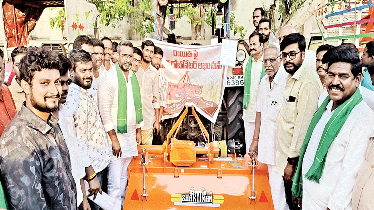 రైతులకు వ్యవసాయ పనిముట్లను పంపిణీ చేస్తున్న ఎమ్మెల్యే శ్యాంబాబు