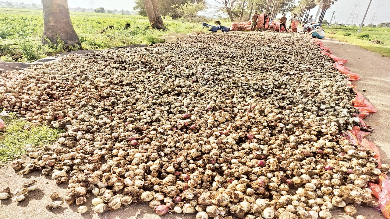 ఉల్లి ధర పతనం కావడంతో రైతు కన్నీరు పెడుతున్నాడు. ప్రారం భంలో ఉన్న ధర దిగుబడి వచ్చిన అనంతరం పతనం కావడంతో రైతుకు దిక్కు తోచడం లేదు