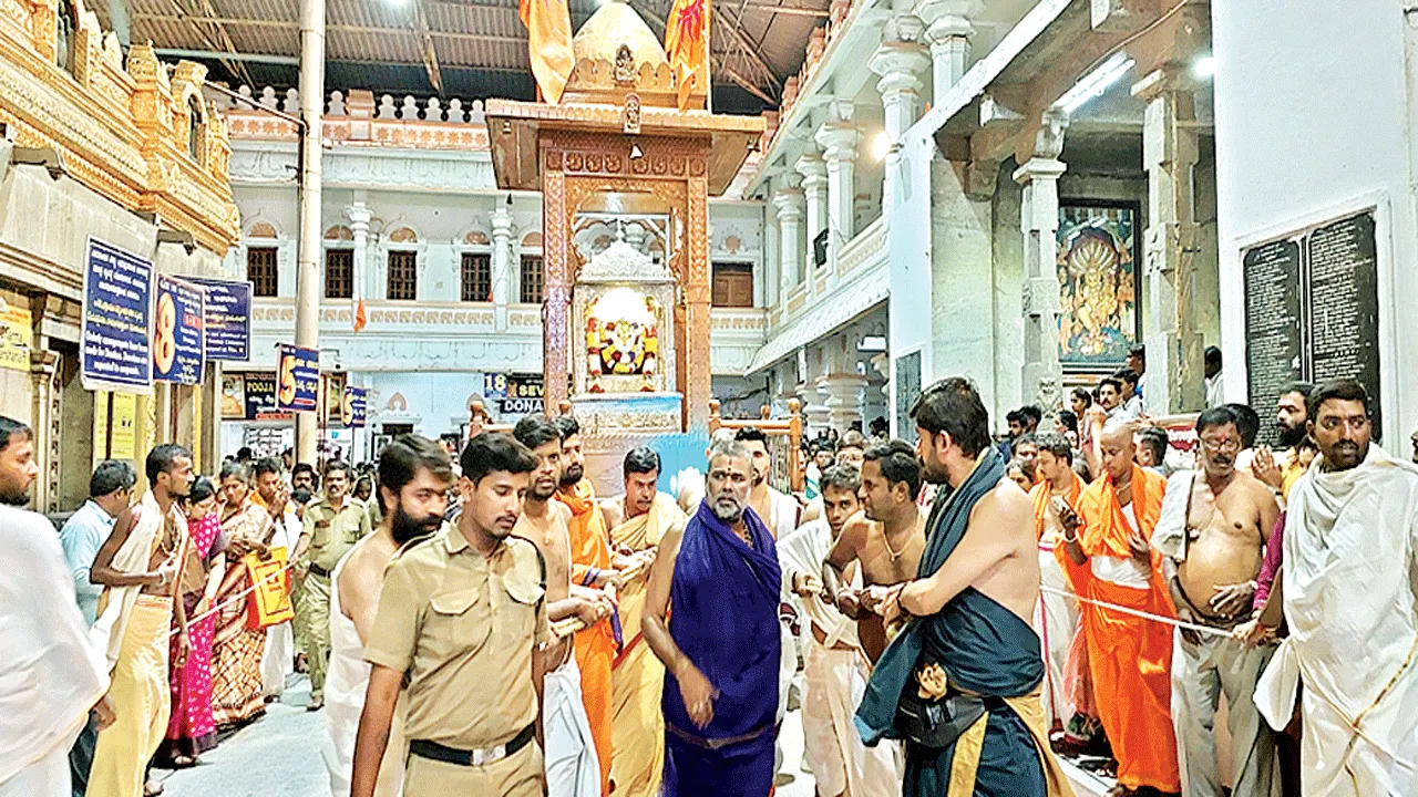 మంత్రాలయం, ఏప్రిల్ 22(ఆంధ్రజ్యోతి): రాఘవేంద్ర స్వామి మఠంలో ఉత్సవమూర్తి ప్రహ్లాదరాయలు చెక్క రథంపై విహరించారు. మంగళవారం చైత్రమాస బహుళ నవమిని పురస్కరించుకొని శ్రీ మఠం పీఠాధిపతి సుబుధేంద్రతీర్థుల ఆఽశీస్సులతో పండితులు, అర్చకులు రాఘవేంద్రస్వామి మూల బృందావనానికి విశేష పూజలు నిర్వహిం చారు. చెక్క రథాన్ని వివిధ పుష్పాలతో అలంకరించి, వేదపండితుల మంత్రోచ్ఛారణాలు, మంగళవాయిద్యాలు భక్తుల హర్షద్వానాల మధ్య ప్రహ్లాదరాయలను అధిష్టించి ఆలయ ప్రాంగణ ం చుట్టూ ఊరేగించారు. అనంతరం ఊంజల మంటపంలో ఊంజలసేవలో స్వామివారిని ఊగించారు. అంతకుముందు స్వామివారికి పాదపూజ చేసి పల్లకీలో ఊరేగించి హారతులు నిర్వహించారు. పండితులు సంస్థాన పూజలో భాగంగా మూలరాములకు బంగారు నాణేలతో అభిషేకించారు.
