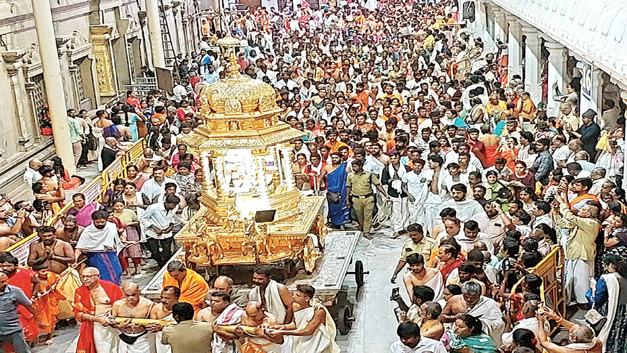 మంత్రాలయం, ఏప్రిల్ 23(ఆంధ్రజ్యోతి): రాఘవేంద్ర స్వామి మఠంలో ఉత్సవమూర్తి ప్రహ్లాదరాయలు స్వర్ణ రథంపై విహారించారు. బుధవారం చైత్ర దశమి శుభదినం ను పురస్కరించుకొని శ్రీ మఠం పీఠాధిపతి సుబుధేంద్ర తీర్థుల ఆఽశీస్సులతో బృందావనానికి ప్రత్యేక పూజలు నిర్వహించారు. సుప్రభాతం, నిర్మల విసర్జనం, క్షీరాభిషేకం, విశేష పంచామృతాభిషేకం చేసి వెండి, బంగారు, పట్టువస్ర్తాలతో బృందావనాన్ని శోభాయమానంగా అలంకరించారు. భక్తులను ఎంతగానో ఆకట్టుకుంది. వేద పండితుల మంత్రోచ్ఛరణాలు, మంగళ వాయిద్యాల, విద్యుతదీపాల మధ్య స్వర్ణ రథంపై ప్రహ్లాదరాయలను అధిష్టించి ఆలయ ప్రాంగణ ం చుట్టూ ఊరేగించారు. అనంతరం ఉత్సవమూర్తికి ఊంజల సేవ నిర్వహించారు. మఠం పండితులు భక్తులకు ఫల, పుష్ప, మంత్రాక్షితలు ఇచ్చి ఆశీర్వదించారు. వివిధ రాష్ర్టాల నుంచి పెద్దఎత్తున భక్తులు తరలి రావడంతో మంత్రాలయం కిక్కిరిసింది.