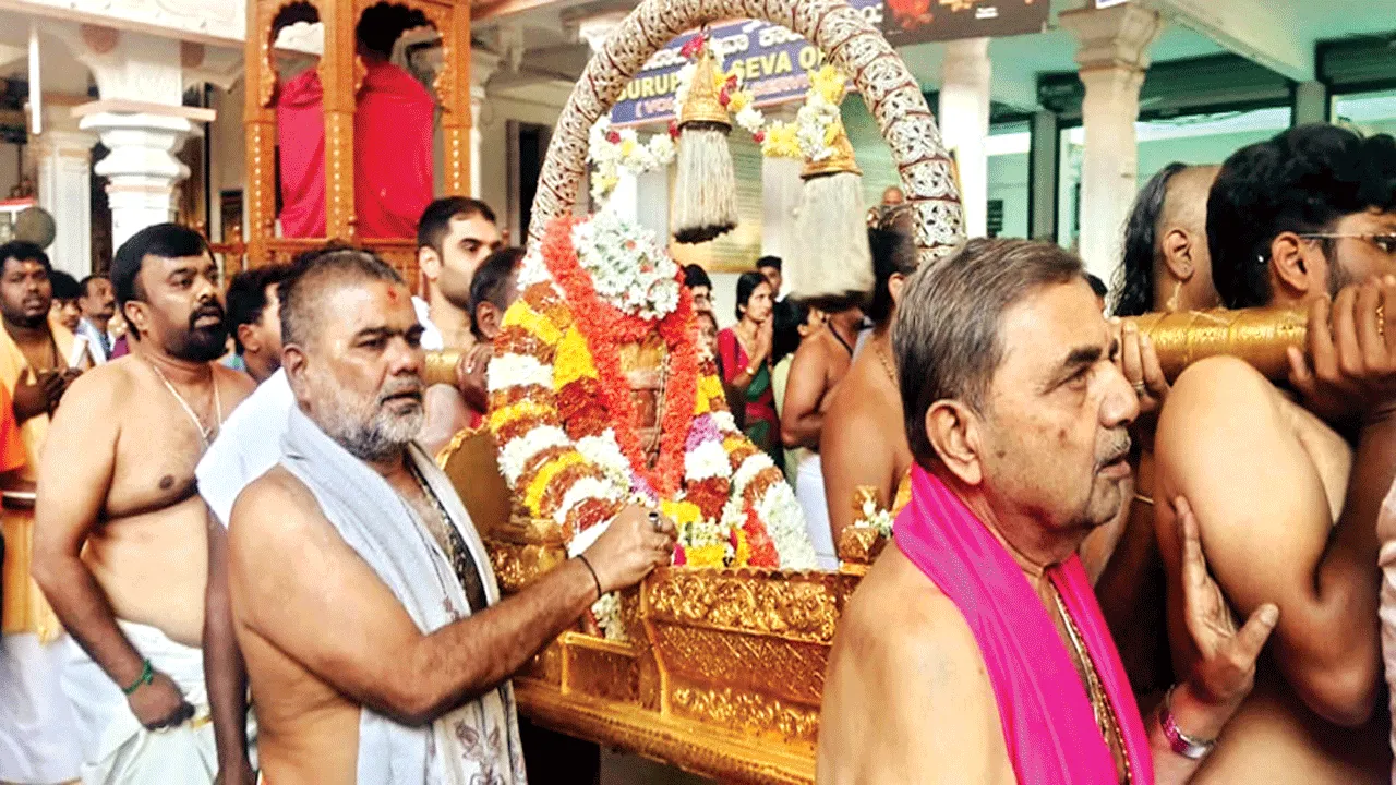 మంత్రాలయం, డిసెంబరు 11(ఆంధ్రజ్యోతి): వేద పండితుల మంత్రోచ్ఛరణలు. మంగళవాయిద్యాల మధ్య రాఘవేంద్ర స్వామి స్వర్ణ పల్లకిలో భక్తులకు దర్శనమిచ్చారు. స్వామి సజీవ సమాధి పొందిన గురువారం శుభదినాన్ని పురస్కరించుకొని మఠం పీఠాఽధిపతి సుబుధేంద్రతీర్థుల ఆఽశీస్సులతో మఠం అర్చకులు బృందావనానికి ప్రత్యేక పూజలు నిర్వహించారు. రాఘవేంద్రస్వామి మృతిక బృందావన ప్రతిమను స్వర్ణపల్లకిలో అధిష్టించి శ్రీమఠం ప్రాంగణం చుట్టు అంగరంగ వైభవంగా ఊరేగించారు.అనంతరం ఊంజలసేవ నిర్వహించారు.