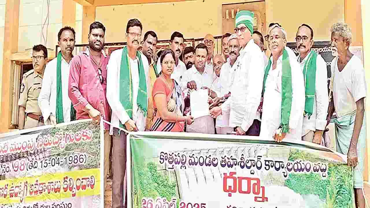 కొత్తపల్లి, ఏప్రిల్ 26 (ఆంధ్రజ్యోతి): శ్రీశైలం ప్రాజెక్టు ముంపు బాధితులను ఆదుకోవాలని రాయలసీమ సాగునీటి సాధన సమితి అధ్యక్షులు బొజ్జా దశరథరామిరెడ్డి డిమాండ్ చేశారు. శనివారం కొత్తపల్లి తహసీల్దార్ కార్యాలయం ఎదుట శ్రీశైలం ప్రాజెక్టు ముంపు ప్రాంతాల హక్కుల సాధన సమితి ఆధ్వర్యంలో ధర్నా నిర్వహించారు. ఈ సందర్భంగా బొజ్జా దశరథరామిరెడ్డి మాట్లాడుతూ శ్రీశైలం డ్యాంలో 854 అడుగుల వద్ద నీటి మట్టం ఉంటేనే రాయలసీమలోని బీడు భూములకు సాగునీరు అందుతుందన్నారు. రాష్ట్ర ప్రజల ప్రయోజనాల కోసం నందికొట్కూరు ప్రాంతంలో కేసీ ఆయకట్టు కింద ఉన్న సుమారు 50వేల ఎకరాలతో పాటు 66 గ్రామాలు సైతం ప్రాజెక్టు నిర్మానంలో ముంపునకు గురయ్యాయని గుర్తు చేశారు. రాష్ట్ర అభివృద్ధికి త్యాగం చేసిన ముంపు ప్రాంతాల నిర్వాసితులను ప్రభుత్వం గుర్తించకపోవడంతో వారి జీవనం నేడు దుర్భరంగా మారిందన్నారు. 1986లో నాటి టీడీపీ ప్రభుత్వం 98 జీవో ద్వారా ముంపు ప్రాంతాల్లోని కుటుంబాల్లోని నిరుద్యోగులకు ఇంటికోక ఉద్యోగం నిర్ణయించినప్పటికీ కొద్ది మందికి ఇచ్చి చేతులు దులుపుకున్నారని ఆగ్రహం వ్యక్తం చేశారు. అలాగే ప్రాజెక్టు కింద ముంపునకు గురైన గ్రామాల్లో ప్రతి ఎకరాకు సాగునీరు, తాగునీరు అందించాలని డిమాండ్ చేశారు. అనంతరం తహసీల్దార్ ఉమారాణికి వినతి పత్రం అందజేశారు. ఈ కార్యక్రమంలో సాగునీటి సాధన సమితి అధ్యక్షుడు వైఎన్ రెడ్డి, సామాజిక రాయలసీమ పార్టీ అధ్యక్షుడు డాక్టర్ నాగన్న, కొక్కెరంచ సర్పంచ్ విష్ణువర్దన్ రెడ్డి, సాయిరాం, అయ్యపురెడ్డి, శంకర్గౌడు, మహేష్, రహంతుల్లా, రాము,సాయి చరణ్, పెద్దరాముడు, నారాయణరెడ్డి పాల్గొన్నారు.