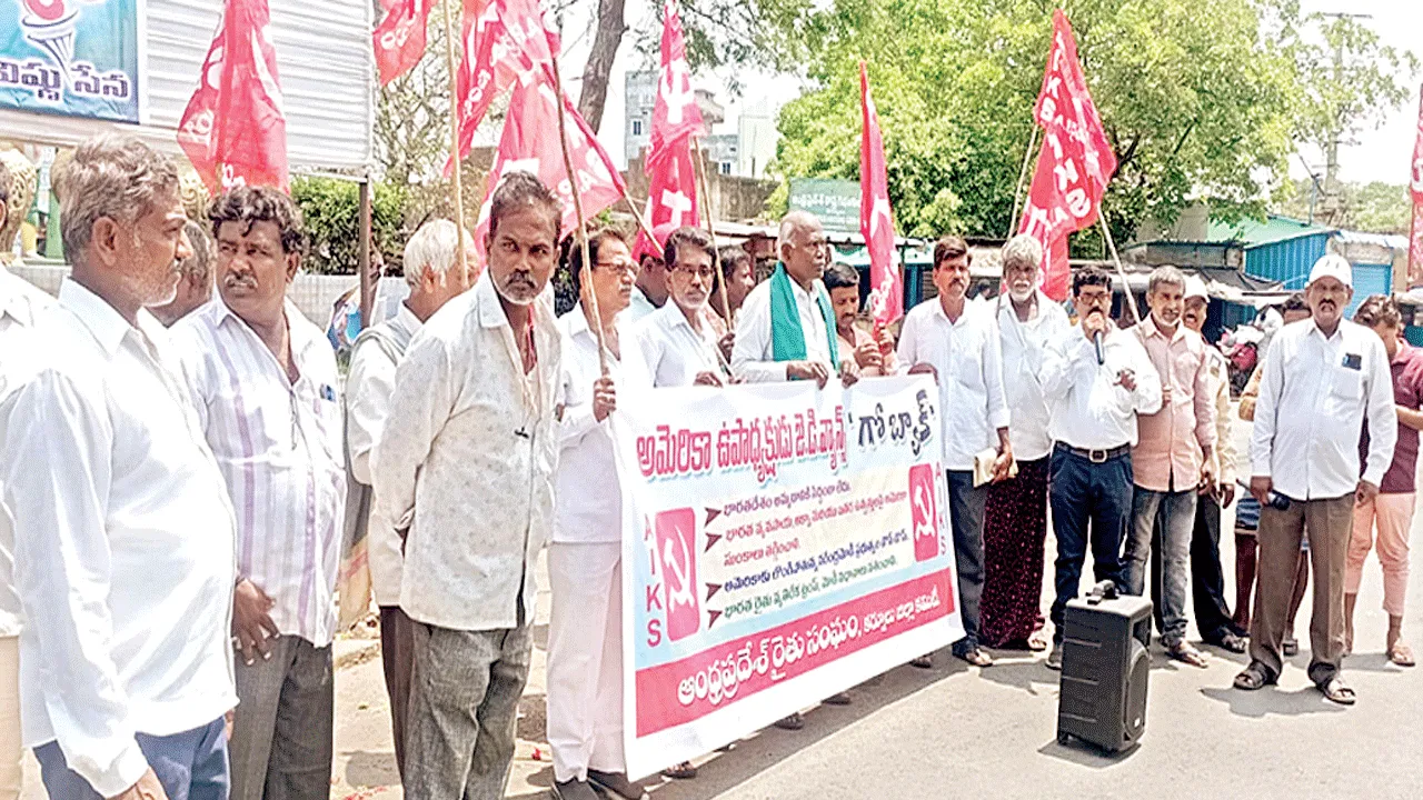 అమెరికా దేశం భారత వ్యవసాయ ఉత్పత్తులపై సుంకాలు తగ్గించాలని ఏపీ రైతు సంఘం రాష్ట్ర ప్రధాన కార్యదర్శి కె.ప్రభాకర్రెడ్డి డిమాండ్ చేశారు.