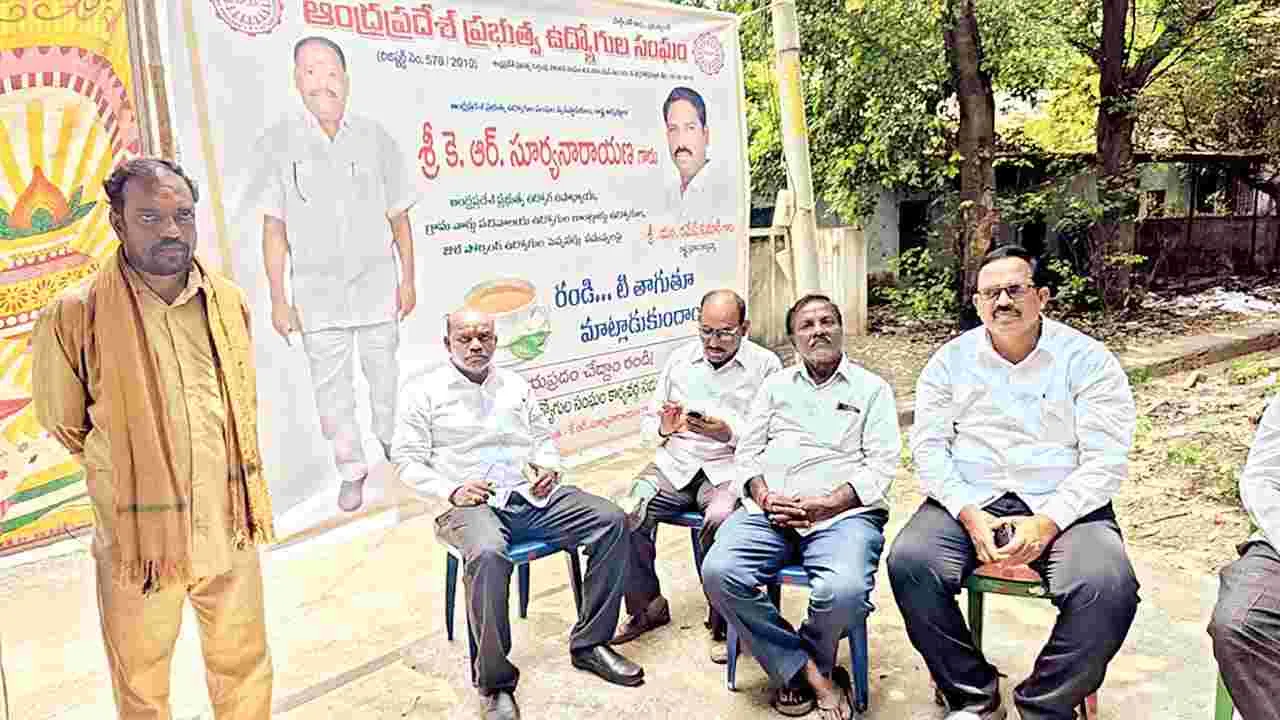 నంద్యాల ఎడ్యుకేషన్, ఆగస్టు 5 (ఆంధ్రజ్యోతి): రాష్ట్రంలో ఉద్యోగుల సమస్యలపై ప్రభుత్వం స్పందించాలని ఏపీ ప్రభుత్వ ఉద్యోగుల సంఘం జిల్లా అధ్యక్షుడు నా గేంద్రప్ప అన్నారు. మంగళవారం రాష్ట్ర కమిటీ పిలుపుమేరకు నంద్యాల మైనర్ ఇరిగేషన్ కార్యాలయం వద్ద ‘రండి టీ తాగుతూ మాట్లాడుకుందాం’ కార్యక్రమాన్ని నిర్వహించారు. ఈసందర్భంగా ఆయన మాట్లాడుతూ గత పాలకులు ఉద్యోగులను పూర్తిగా విస్మరించారని, నేటి ప్రభుత్వంపై ఎన్నో ఆశలు పెట్టుకున్న ఉద్యోగుల సమస్యలపై స్పందించకపోవడం ఆవేదనకు గురిచేస్తోందనన్నారు. రాష్ట్రఅధ్యక్షుడు సూర్యనారాయణ పుట్టినరోజు సందర్భంగా కేకును కట్చేశారు. నాయకులు సుధాకర్, శ్రీనివాసులు, తిరుపాల్, ఫకృద్దీన్, విజయలక్ష్మి, సురేష్ పాల్గొన్నారు.
