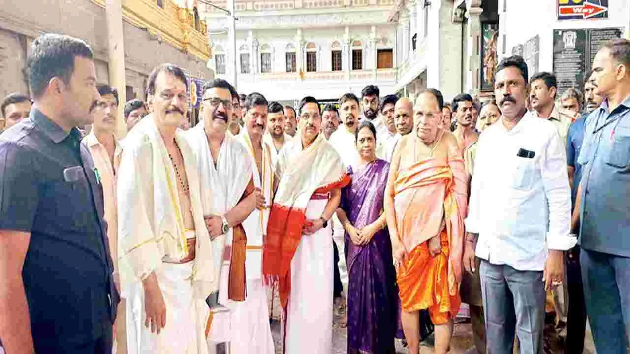 మంత్రాలయం, జూన్ 16 (ఆంధ్రజ్యోతి): మంత్రాలయం రాఘవేంద్రస్వామి దర్శనార్థం కేంద్ర పౌర సరఫరాలు, వినియోగ దారుల వ్యవహారాల శాఖ మంత్రి ప్రహ్లాదజోషి కుటుంబ సమేతంగా రాఘవేంద్రస్వామిని దర్శించుకున్నారు. అలాగే కర్నూలు ఎంపీ బస్తిపాటి నాగరాజు స్వామివారిని దర్శించుకున్నారు. ఆదివారం రాత్రి మంత్రాలయానికి చేరుకుని పద్మనాభతీర్థ అతిథి గృహంలో బస చేసిన విషయం తెలిసిందే. సోమవారం ఉదయం ఆలయ ముఖద్వారం వద్ద మఠం ఏఏవో మాధవశెట్టి, మఠం మేనేజర్లు ఎస్కే శ్రీనివాసరావు, వెంకటేష్ జోషీ సురేష్ కోనాపూర్, శ్రీపతాచార్, అసిస్టెంట్ మేనేజర్ ఐపి నరసింహమూర్తి ఘనంగా స్వాగతం పలికారు. గ్రామ దేవత మంచాలమ్మను దర్శించుకుని హారతులు ఇచ్చారు. రాఘవేంద్రస్వామి మూల బృంధావనానికి విశేష పూజలు చేసి ప్రహ్లాదరాయల పాదపూజలో పాల్గొని తరించారు. సాయంత్రం కలెక్టర్ రంజిత్ బాషా, జిల్లా ఎస్పీ విక్రాంత్ పాటిల్ కేంద్ర మంత్రికి పుష్పగుచ్చం ఇచ్చి స్వాగతం పలికారు. రాత్రి రథోత్సవాల ఊరేగింపులో పాల్గొని పీఠాధిపతి సుబుధేంద్రతీర్థులు రాఘవేంద్రస్వామి మెమెంటో, పట్టువస్త్రం ఫలపుష్ఫ మంత్రాక్షితలు, పరిమళ ప్రసాదం ఇచ్చి కేంద్రమంత్రిని సత్కరించారు. జిల్లా వినియోగదారుల వివాదాల పరిష్కార కమిషన్ అధ్యక్షుడు కిశోర్కుమార్, సభ్యుడు నారాయణరెడ్డి, బీజేపీ జిల్లా అధ్యక్షుడు రామకృష్ణ, రాయచూర్ కలెక్టర్ నితీశ్, ఎస్పీ పుట్ట మాదయ్య, ట్రాన్స్కో సీఎండీ సంతో్షరావు, ఎస్ఈ ఉమాపతి, డీఈ పురుషోత్తం, ఏఈ గోవిందు, జిల్లా ఫుడ్ ఇన్స్పెక్టర్ రాజగోపాల్, టీడీపీ నాయకులు మద్దిలేటి, చంద్రశేఖర్, కేంద్ర ఇండిపెండెంట్ డైరెక్టర్ గిరీష్ ఆదోని సబ్ కలెక్టర్ మౌర్య భరద్వాజ్, ఎమ్మిగనూరు డీఎస్పీ ఉపేంద్రబాబు, తహసీల్దార్ ఎస్.రవి, నార్త్ జోన్ శ్రీమఠం విచారణకర్త శ్రీనివాస కస్బే ఉన్నారు.