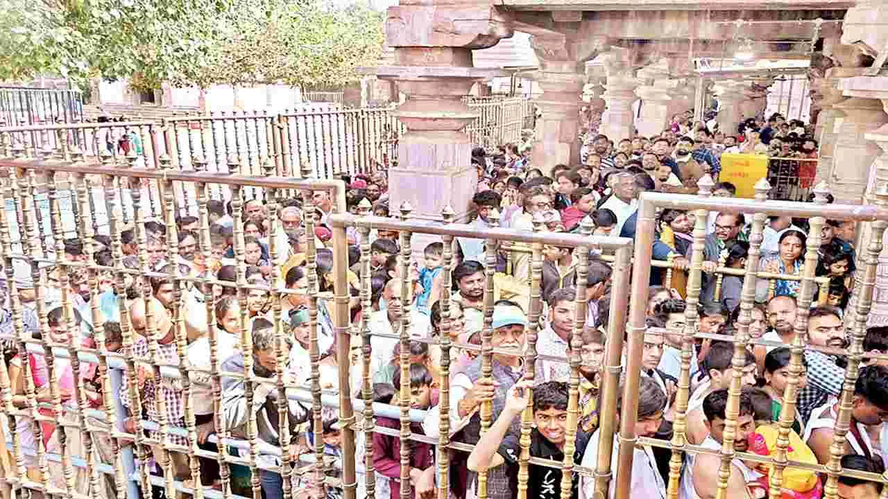 శ్రీశైలం, డిసెంబరు 28 (ఆంధ్రజ్యోతి) : శ్రీశైలం క్షేత్రంలో మల్లన్న దర్శనం కోసం భక్తులు నిరీక్షించాల్సిన పరిస్థితి. భక్తుల రద్దీ రోజురోజుకు పెరుగుతూనే ఉంది. సాధారణ రోజుల కంటే సెలవు రోజుల్లో వచ్చే యాత్రికు లను ముందుగానే అంచనావేస్తూ దేవస్థానం అఽఽధికారులు తగిన ఏర్పాట్లను చేస్తున్నారు. వరుస సెలవులు కావడంతో ఉత్తర, దక్షిణాది ప్రాంతాల నుంచి ఊహించని విధంగా భక్తులు ఒక్కసారిగా రావడంతో ఇబ్బందులు ఎదుర్కోవలసి వచ్చింది. ఉభయ దేవాలయాల్లో దర్శనాలు పూర్తిచేసుకునేందుకు అధిక సమయం పడుతున్నందున భక్తులు తీవ్ర అసహనానికి గురయ్యారు. దేవస్థానం వారు జారీ చేసిన వీఐపీ బ్రేక్ భక్తులకు అలంకార దర్శనం మాత్రమే కల్పిస్తుస్తున్నప్పటికీ రోజు కు మూడు విడతలు ఉండటం సామాన్యుల సర్వ దర్శనాలకు అడ్డంకిగా మారు తుందని భక్తులు ఆవేదన చెందుతున్నారు.