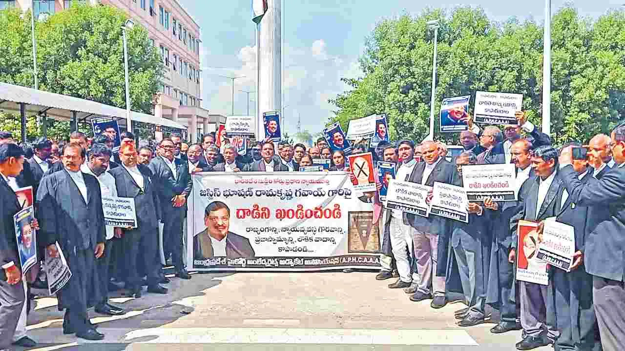 సుప్రీంకోర్టు ప్రధాన న్యాయమూర్తి జస్టిస్ బీఆర్ గవాయ్ పై దాడి యత్నాన్ని నిరసిస్తూ హైకోర్టు వద్ద న్యాయవాదులు నిరసన తెలిపారు.