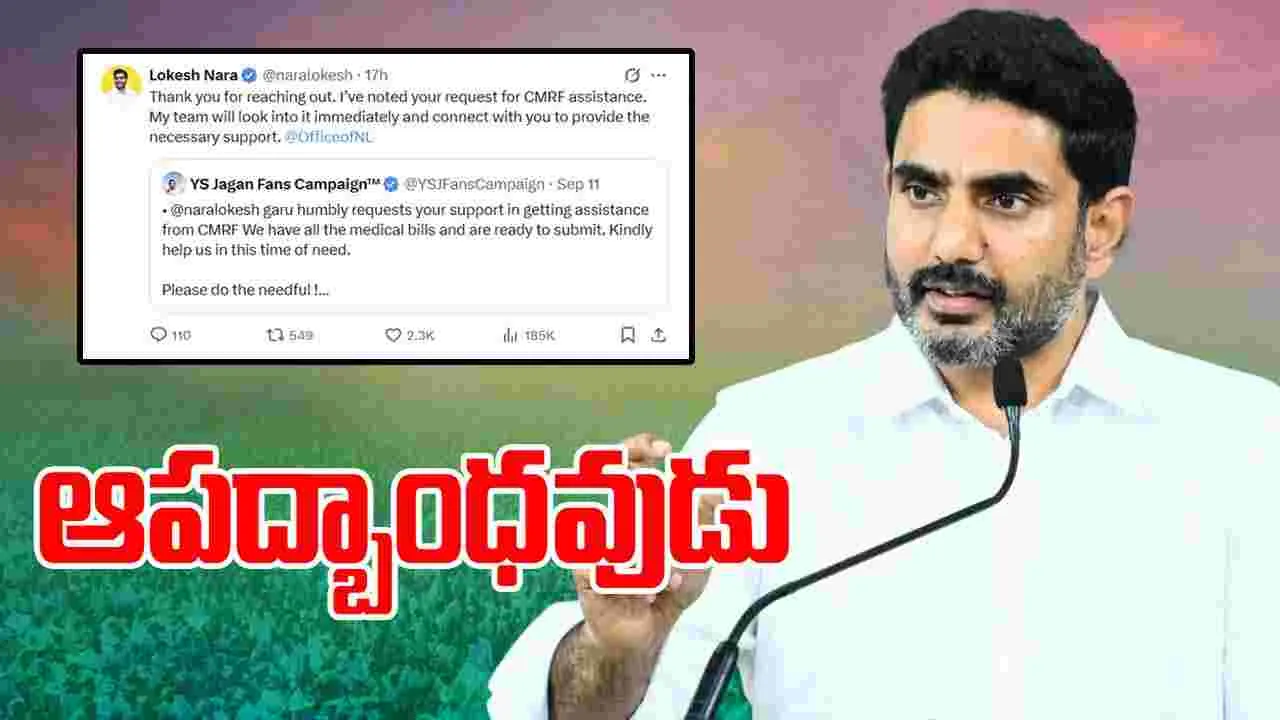 అమరావతి, సెప్టెంబర్ 13: ఆంధ్రప్రదేశ్ ఐటీ, విద్య శాఖల మంత్రి నారా లోకేశ్ మరో సారి తన ఉదారతను చాటుకున్నారు. వైసీపీ కార్యకర్తకు మంత్రి లోకేశ్ సాయం చేస్తానని అభయ హస్తం అందించారు. తాను ఆపదలో ఉన్నానని.. ముఖ్యమంత్రి సహాయ నిధి (సీఎంఆర్ఎఫ్) ద్వారా తనకు సహయం అందించాలంటూ మంత్రి నారా లోకేశ్ను వైసీపీ కార్యకర్త సోషల్ మీడియా ద్వారా అభ్యర్థించారు. జగన్ ఫ్యాన్స్ క్యాంపెయిన్ పేరుతో మంత్రి నారా లోకేశ్కు వైసీపీ కార్యకర్త ట్వీట్ చేశారు.