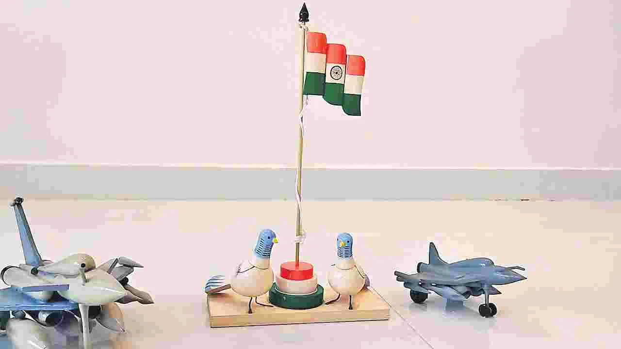 ఎలమంచిలి, ఆగస్టు 14(ఆంధ్రజ్యోతి): అనకాపల్లి జిల్లా ఏటికొప్పాక గ్రామానికి చెందిన యువ హస్త కళాకారుడు గుత్తి వాసు స్వాతంత్య్ర దినోత్సవాన్ని పురస్కరించుకుని అంకుడు కర్ర, సహజ సిద్ధమైన రంగుల మేళవింపుతో రూపొందించిన కళారూపాలు విశేషంగా ఆకట్టుకుంటున్నాయి. బీఈడీ చేసిన వాసు గ్రామంలోని ప్రైవేటు పాఠశాలలో ఉపాధ్యాయునిగా చేస్తూ, మరోపక్క హస్తకళావృత్తిని కొనసాగిస్తున్నారు. ఆరు రోజులపాటు శ్రమించి అంకుడు కర్రతో 38 సెంటీమీటర్ల పొడవు, 23 సెంటీమీటర్ల వెడల్పు కలిగిన జాతీయ పతాకాన్ని, శాంతికి చిహ్నమైన రెండు పావురాలను తయారుచేశారు. పక్షం రోజుల క్రితం రెండు రాఫెల్ యుద్ద విమానాలను, అగ్ని-5 ఖండాంతర బాలిస్టిక్ క్షిపణిని రూపొందించారు. వీటిని ముఖ్యమంత్రి చంద్రబాబునాయుడు, ఉప ముఖ్యమంత్రి పవన్ కల్యాణ్ల సహకారంతో ప్రధాని నరేంద్రమోదీకి అందజేయాలనుకుంటున్నట్టు వాసు ‘ఆంధ్రజ్యోతి’కి తెలిపారు.