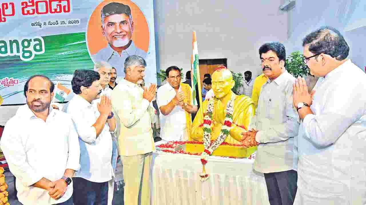 విజయవాడ సిటీ, ఆగస్టు 11(ఆంధ్రజ్యోతి): ఆర్థిక, రక్షణ, సాంకేతిక రంగాల్లో ప్రపంచంతో పోటీపడుతూ మన దేశం అగ్రస్థానానికి చేరుకుంటుందని ముఖ్యమంత్రి చంద్రబాబు అన్నారు. పౌరుల్లో ఉండే జాతీయభావమే దేశాన్ని అన్నిరంగాల్లో మొదటి స్థానంలో నిలుపుతుందని, స్వాతంత్య్ర సమరయోధులను స్ఫూర్తిగా తీసుకుని పింగళి వెంకయ్య రూపొందించిన జాతీయ జెండాను ఇంటింటా ఎగురవేయాలని పిలుపిచ్చారు. రాష్ట్ర భాషా సాంస్కృతిక శాఖ ఆధ్వర్యంలో విజయవాడలోని తుమ్మలపల్లి కళాక్షేత్రంలో ‘హర్ ఘర్ తిరంగా’ (ఇంటింటికీ జాతీయ జెండా) కార్యక్రమాన్ని సోమవారం నిర్వహించారు. ముఖ్య అతిథిగా విచ్చేసిన సీఎం మాట్లాడుతూ.. శక్తి, స్ఫూర్తి, ఉద్వేగం, అనుబంధం, ఐక్యతకుమారుపేరు మువ్వన్నెల జెండా అని తెలిపారు. ఆజాదీ కా అమృత్ మహోత్సవ్లో భాగంగా ప్రతి ఒక్కరిలో దేశభక్తిని నింపాలనే ఉద్దేశంతో హర్ ఘర్ తిరంగాకు ప్రధాని శ్రీకారం చుట్టినట్లు చెప్పారు. కులం, మతం, భాష, ప్రాంతీయ విభేదాల్లేకుండా జాతీయ స్ఫూర్తిని నింపే త్రివర్ణ పతాకాన్ని ప్రతి ఇంటిపైనా ఎగురవేసి, ప్రతి ఒక్కరూ జాతికి పునరంకితమై దేశాభివృద్ధిలో భాగస్వాములు కావాలని కోరారు. మోదీ నాయకత్వంలో దేశం బలమైన ఆర్థిక వ్యవస్థగా మారుతోందని చెప్పారు. భారతదేశానిది డెడ్ ఎకానమీ అని ట్రంప్ చేసిన వ్యాఖ్యలను ఖండించారు. 143 కోట్ల మంది సామర్థ్యాన్ని చాటే జాతీయ జెండాను అందించిన పింగళి వెంకయ్య తెలుగు వారు కావడం మన అదృష్టమన్నారు. ఈ సందర్భంగా స్వాతంత్య్రం కోసం పోరాడిన అల్లూరి సీతారామరాజు, టంగుటూరి ప్రకాశం పంతులు, ఉయ్యాలవాడ నరసింహారెడ్డి, సర్దార్ గౌతు లచ్ఛన్న, దుగ్గిరాల గోపాలకృష్ణయ్యను సీఎం స్మరించుకున్నారు. కార్యక్రమంలో మంత్రులు దుర్గేశ్, సత్యకుమార్, ఎమ్మెల్యే బొండా ఉమా పాల్గొన్నారు. అనంతరం సమరయోధుల కుటుంబీకులను సీఎం ఘనంగా సత్కరించారు. పింగళి జీవితచరిత్ర పుస్తకాన్ని, చిత్రపటాన్ని ఆవిష్కరించారు.
