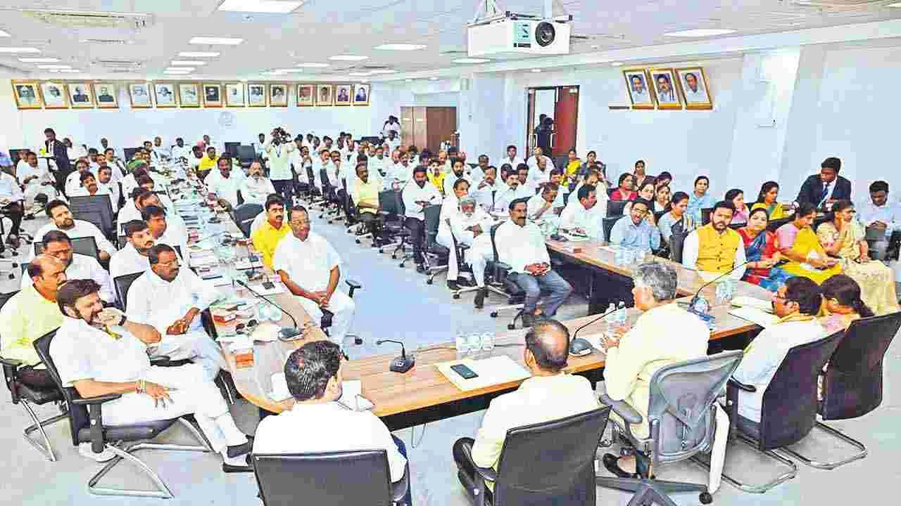 సూపర్-6 హామీల అమలుకు ప్రాధాన్యం ఇచ్చాం. అన్నదాత, తల్లికి వందనం పథకాలకు నిధులు కేటాయించాం. మే నుంచి వాటిని అమలు చేస్తాం. మహిళలకు ఉచిత ఆర్టీసీ ప్రయాణం కూడా అమలు చేస్తాం. గృహనిర్మాణానికి ప్రభుత్వం ఇప్పటి వరకు ఎస్సీ, ఎస్టీలకే అదనంగా నిధులిస్తోంది. ఇకపై బీసీలకూ రూ.50వేలు అదనంగా ఇస్తాం. 2029నాటికి ప్రతి కుటుంబానికి ఇల్లు, నీరు, విద్యుత్, పీఎం సూర్యఘర్ ద్వారా సౌర విద్యుత్, గ్యాస్ సరఫరా, మరుగుదొడ్డి, ఇంటర్నెట్ అందించాలన్న లక్ష్యంతో ముందుకు వెళ్తున్నాం. వాట్సాప్ గవర్నెన్స్లో ప్రస్తుతం 161 సేవలు ఇస్తున్నాం. వీటిని త్వరలోనే 500కు పెంచుతాం. దీనిపై ఎమ్మెల్యేలు ఫీడ్ బ్యాక్ తీసుకోవాలి. వేసవికాలంలో నీటి సమస్య లేకుండా చూసేందుకు ఓ యాప్ కూడా తీసుకొస్తున్నాం. ప్రతి ఎంపీ, ఎమ్మెల్యే వారి నియోజకవర్గాన్ని ఏ విధంగా అభివృద్ధి చేస్తారో ప్రణాళికాపత్రం తయారు చేసుకోవాలి. త్వరలో ఎమ్మెల్యేలతో ముఖాముఖి నిర్వహిస్తాం. అసెంబ్లీలో ఏ ఎమ్మెల్యే ఎంతసేపు ఉన్నారో కూడా త్వరలో స్ర్కీన్పై చూ పిస్తాం. ప్రతి సభ్యుడూ సభ జరిగే సమయం లో అసెంబ్లీలో ఉండాల్సిందే.