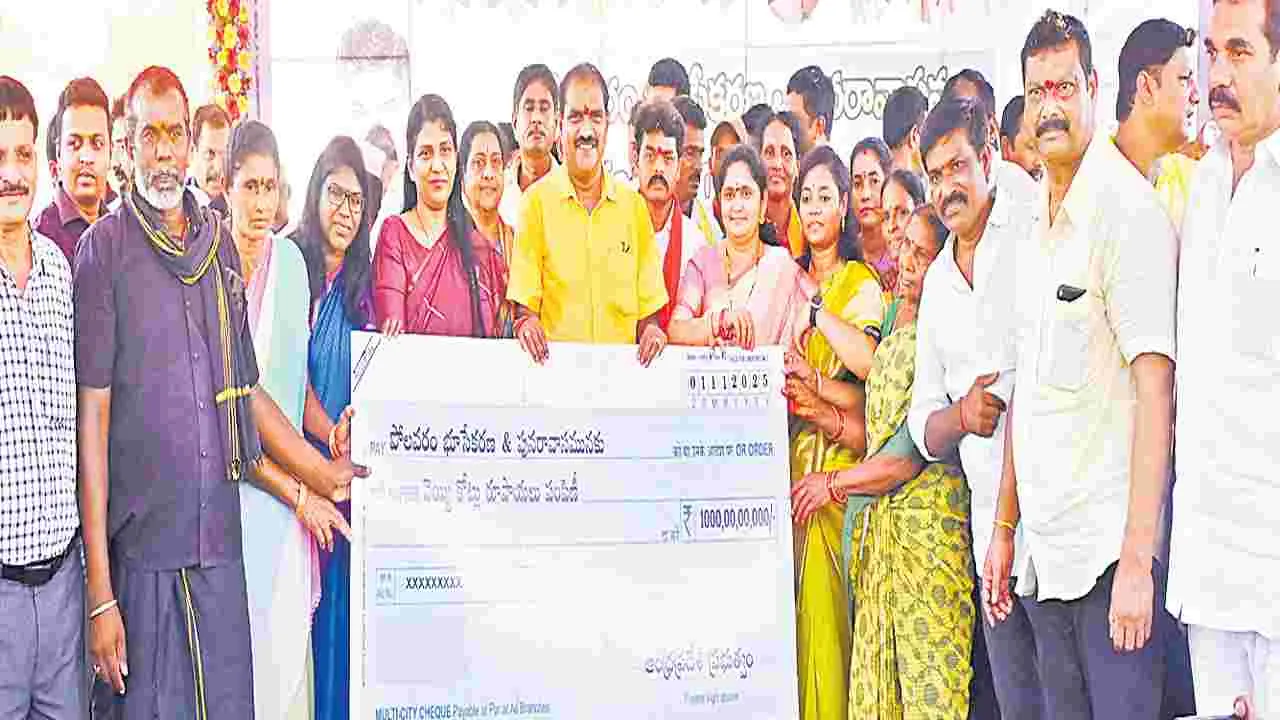 ఏలూరు/వేలేరుపాడు, నవంబరు 1(ఆంధ్రజ్యోతి): ‘ఆంధ్ర రాష్ట్ర జీవనాడి పోలవరం ప్రాజెక్టును 2027 డిసెంబరు నాటికి పూర్తి చేస్తాం. దానికి ఆరు నెలల ముందే పునరావాసం, కాలనీల నిర్మాణం పూర్తి చేయడానికి కూటమి ప్రభుత్వం కృతనిశ్చయంతో ఉంది’ అని మంత్రి నిమ్మల రామానాయుడు స్పష్టం చేశారు. పోలవరం భూసేకరణ - పునరావాసం నిమిత్తం కేంద్రం రూ.1,000 కోట్ల విడుదల చేసింది. ఈ నేపథ్యంలో ఏలూరు జిల్లా వేలేరుపాడులో నిర్వాసితులకు పరిహారం చెక్కుల పంపిణీ కార్యక్రమం శనివారం అట్టహాసంగా జరిగింది. ప్రధాని నరేంద్ర మోదీ, సీఎం చంద్రబాబు, డిప్యూటీ సీఎం పవన్ కల్యాణ్ చిత్రపటాలకు ఆయన లబ్ధిదారులతో కలసి పాలాభిషేకం చేశారు. సభ ప్రారంభమైన గంటలోనే నిర్వాసితుల ఖాతాల్లో రూ.45 కోట్లు జమ అయ్యాయి. ఈ సందర్భంగా మంత్రి మాట్లాడారు. ‘ఈ ఏడాది జనవరి 3న రూ.900 కోట్లు పరిహారం లబ్ధిదారుల ఖాతాల్లో జమ చేశాం. 2016లో తొలి విడతగా రూ.700 కోట్లు జమ చేసిన ఘనత టీడీపీ ప్రభుత్వానిదే. కూటమి ప్రభుత్వం అధికారంలో వచ్చిన 18 నెలల కాలంలోనే రెండో విడతగా నిధులు జమ చేశాం. 41.15 కాంటూరు పరిధిలోని నిర్వాసితులకు పరిహారం, ఇతర కాలనీల నిర్మాణాన్ని జూన్ 2026కు పూర్తి చేస్తాం. ఇళ్ల నిర్మాణానికి రూ.739 కోట్లతో టెండర్లు పూర్తి అయ్యాయి. డిసెంబరులో పనులు ప్రారంభం అవుతాయి. వైసీపీ హయాంలో 2022 నుంచి అటకెక్కించిన భూసేకరణను ఒక కొలిక్కి తీసుకొస్తున్నాం. 17,114 కుటుంబాలకు సంబంధించిన భూసేకరణ, పునరావాసం పరిహారాన్ని 2026 డిసెంబరు నాటికి అందించి తీరుతాం. రెండో విడత పరిహారంపై మరింత దృష్టి సారిస్తాం.