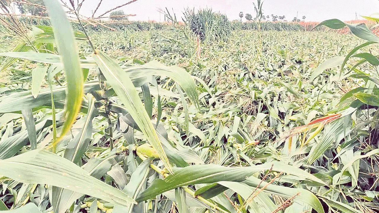 మండలంలో బుధవారం తెల్లవారుజామున వీచిన పెనుగాలులకు కండె గింజ పోసుకునే దశలో ఉన్న మొక్కజొన్న పైరు నేలవాలగా, వర్షం ధాటికి కల్లాలలో ఆరబెట్టిన మొక్కజొన్న తడిచాయి. మూడున్నర గంటల సమయంలో ఒక్కసారిగా వీచిన పెను గాలులతో కూడిన వర్షంతో పంటలకు నష్టం వాటిల్లింది.