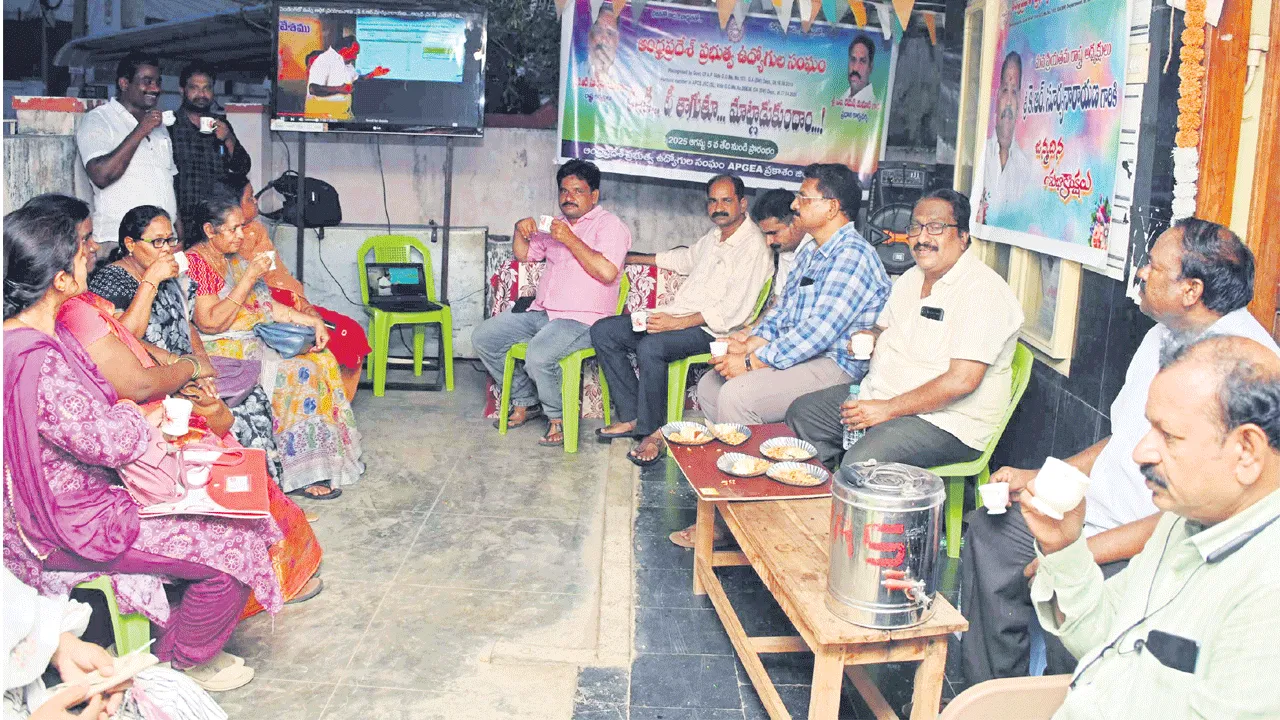 ఒంగోలు కలెక్టరేట్, ఆగస్టు 5 (ఆంధ్రజ్యోతి) : ఉద్యోగుల సమస్యలను ప్రభుత్వం వెంటనే పరిష్కరించాలని కోరుతూ ప్రభుత్వ ఉద్యోగుల సంఘం ఆధ్వర్యంలో మంగళవారం జిల్లా వ్యాప్తంగా రండి టీ తాగుతూ మాట్లాడుకుందాం కార్యక్రమాన్ని నిర్వహించారు. రాష్ట్ర కమిటీ ఇచ్చిన పిలుపు మేరకు జిల్లా అధ్యక్షుడు చిన్నపురెడ్డి కిరణ్కుమార్ రెడ్డి ఆధ్వర్యంలో జిల్లాలోని అన్ని యూనిట్ల సంఘ బాధ్యుల ఆధ్వర్యంలో ఈ కార్యక్రమాన్ని నిర్వహించారు. స్థానిక రామనగర్లోని ఫుడ్ సేఫ్టీ కార్యాలయంలో జరిగిన కార్యక్రమానికి కిరణ్కుమార్రెడ్డి అధ్యక్షత వహించారు. ఈ సమావేశంలో పలు అంశాలపై ఉద్యోగులు చర్చించారు. ప్రభుత్వం నుంచి ఉద్యోగులకు రావాల్సిన నాలుగు డీఏలను ఇవ్వాలని, పీఆర్సీ కమిటీని వెంటనే నియమించి ఐఆర్(మధ్యంతర భృతి) ప్రకటించాలని, ఉద్యోగ, ఉపాధ్యాయ, కార్మిక, వివిధ వర్గాల నుంచి సమస్యలను తెలుసుకొని వాటిని పరిష్కారం చేసే విధంగా ప్రభుత్వం చర్యలు తీసుకోవాలని కోరారు. సమావేశంలో జిల్లా కార్యదర్శి వరకుమార్, సంఘం నాయకులు వెంకటేశ్వరరెడ్డి, గోపికృష్ణ, రంగారెడ్డి, ఎం. శ్రీనివాసరావు, ఏసురత్నం, సునీల్, జవహర్వలి, సురే్షబాబు, శ్రీదేవవి, చంద్రశేఖర్, శ్రీనివాసులు, మహిళా అధ్యక్షురాలు డాక్టర్ మానస, వనజ,సుమతి, గౌరీ పాల్గొన్నారు.
