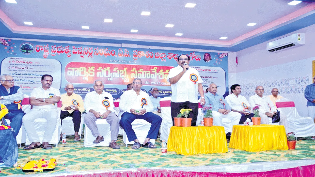 తగ్గించిన అడిషనల్ క్యాంటమ్ ఆఫ్ పెన్షన్ను తిరిగి రాష్ట్ర ప్రభుత్వం పునరుద్ధరించాలని, 12వ పీఆర్సీని వెంటనే ప్రకటించాలని రాష్ట్ర ప్రభుత్వ పెన్షనర్ల సంఘం రాష్ట్ర అధ్యక్షుడు డి.వెంకటేశ్వర్లు డిమాండ్ చేశారు. ఒంగోలు నగరంలోని ఏపీఎన్జీవో భవన్లో సోమవారం రాష్ట్ర ప్రభుత్వ పెన్షనర్ల సంఘం జిల్లా సర్వసమావేశం జిరిగింది. ఈ సమావేశానికి సంఘం జిల్లా అధ్యక్షుడు బడే అంకిరెడ్డి అధ్యక్షత వహించారు