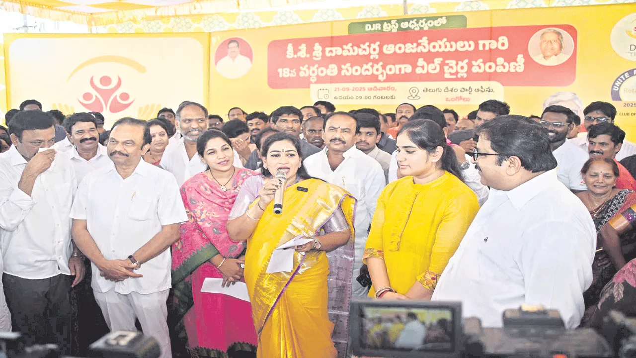 డీజేఆర్ ట్రస్ట్ ఆధ్వర్యంలో నిర్వహిస్తున్న సమాజ సేవా కార్యక్రమాలు అభినందనీయం అని, పేదలకోసం అన్ని విధాలుగా అండగా ఉండేందుకు ఏర్పాటు చేసిన ట్రస్ట్ సేవలు మరింత విస్తృతం కావాలని ఆకాంక్షిస్తున్నట్లు రాష్ట్ర హోం మంత్రి వంగలపూడి అనిత పేర్కొన్నారు. మాజీ మంత్రి స్వర్గీయ దామచర్ల ఆంజనేయులు 18వ వర్ధంతిని పురస్కరించుకుని ఆదివారం పార్టీ కార్యాలయంలో డీజేఆర్ ట్రస్ట్, రోటరీ క్లబ్ ఆధ్వర్యంలో వికలాంగులకు ట్రై సైకిళ్లుపంపిణీ చేశారు.