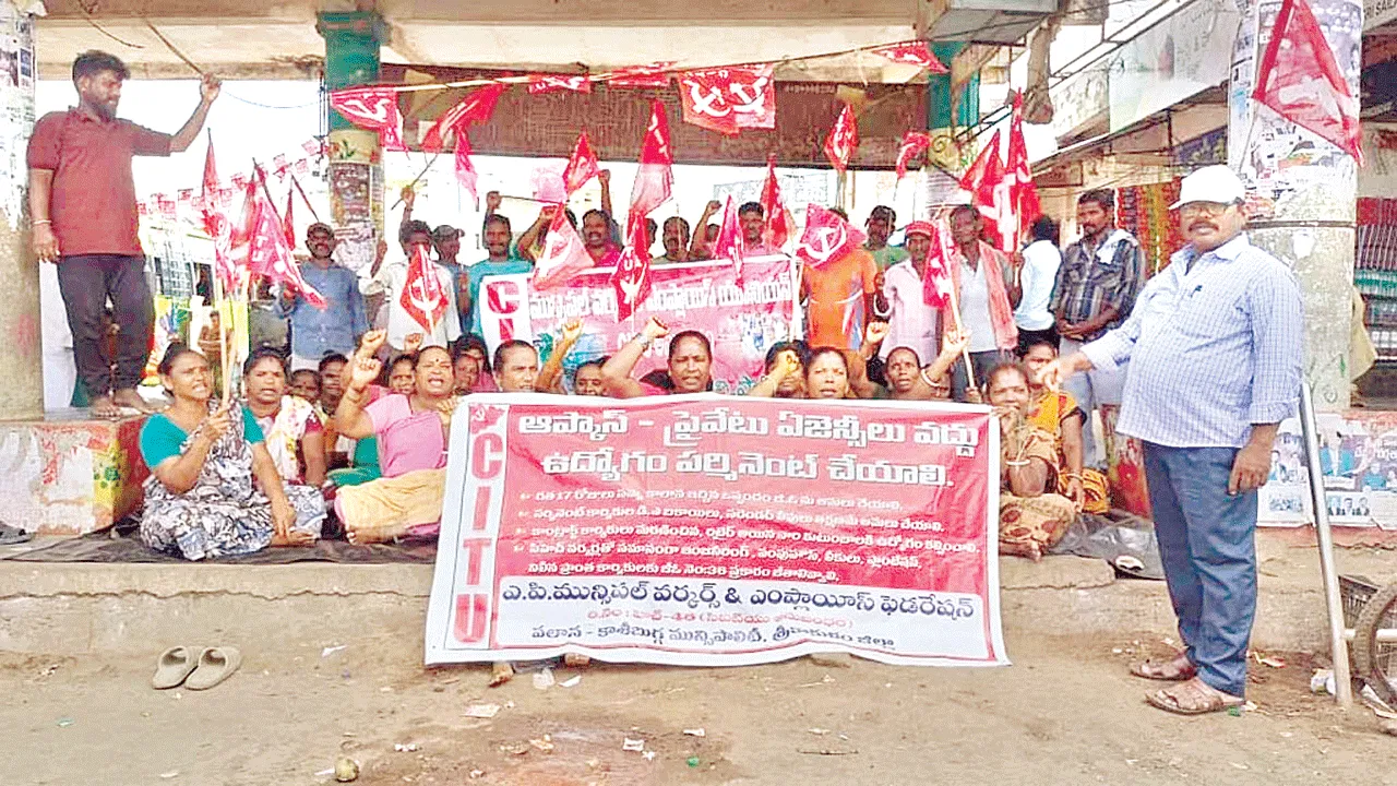 సమ్మెకాలం ఒప్పందాలు అమలు చేయాలని, సమస్య పరిష్కారానికి సంఘ నాయకులతో ప్రభుత్వం చర్చలు జరపాలని సీఐటీయూ జిల్లా కార్యదర్శి ఎన్.గణపతి, మునిసిపల్ వర్కర్స్ యూనియన్ నాయకులు సీహెచ్ మురుగన్, కె.వెంకట్, ఎం.రవి,శంకర్ కోరారు. కాశీబుగ్గలో మునిసిపల్ కార్మికులు చేపట్టిన నిరసన కార్యక్రమం మంగళ వారానికి ఆరోరోజుకు చేరింది.