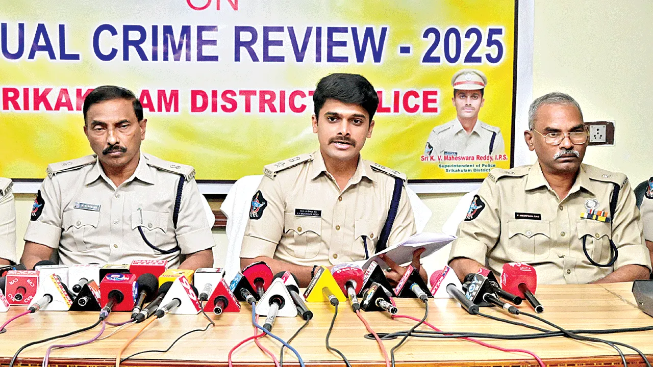శ్రీకాకుళం, డిసెంబరు 30 (ఆంధ్రజ్యోతి): జిల్లా పోలీసుల వ్యూహం ఫలించింది. సాంకేతికత, నిరంతర నిఘా వెరసి జిల్లాలో నేరాల రేటు గణనీయంగా తగ్గింది. 2025 సంవత్సరం జిల్లాలో శాంతిభద్రతల పరంగా అత్యంత సంతృప్తికరంగా ముగిసింది. గతేడాదితో పోలిస్తే ఈ ఏడాది నేరాలు ఏకంగా 34 శాతం తగ్గుముఖం పట్టాయి. మంగళవారం జిల్లా పోలీసు కార్యాలయంలో ఏర్పాటు చేసిన విలేకరుల సమావేశంలో ఎస్పీ మహేశ్వరరెడ్డి 2025 క్రైమ్ రిపోర్ట్ను విడుదల చేశారు. ఈ సందర్భంగా ఆయన మాట్లాడుతూ.. సాంకేతికతను జోడించి చేపట్టిన ‘ప్రివెంటింగ్ పోలీసింగ్’, దత్తత గ్రామాల వ్యవస్థ, డ్రోన్ సర్వేలెన్స్, సీసీ కెమెరాల పెంపు వంటి చర్యలతో నేరాలను గణనీయంగా తగ్గించగలిగామని స్పష్టం చేశారు.