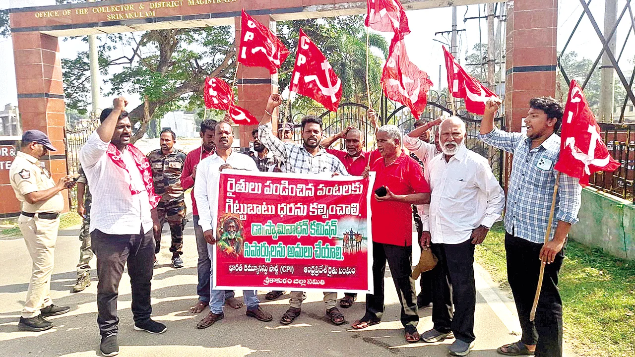 శ్రీకాకుళం కలెక్టరేట్, డిసెంబరు 10(ఆంధ్రజ్యోతి): రైతులు పండించిన పంటకు గిట్టుబాటు ధర ఇవ్వకుంటే పోరాటం తప్పదని సీపీఐ జిల్లా కార్యదర్శి చాపర వెంకటరమణ అన్నారు. ఈ మేరకు బుధవారం కలెక్టరేట్ వద్ద రైతు సమస్యలపై నిరసన ప్రదర్శన నిర్వహించారు. ఈ సందర్భంగా ఆయ న మాట్లాడుతూ.. ఖరీఫ్ సీజన్లో 50 లక్షల మెట్రిక్ టన్నుల ధాన్యం కొనుగోలు చేస్తామని, 6.70 కోట్ల గోనుసంచులు అందుబాటులో ఉంచుతామని ప్రభుత్వం చెప్పినా ఆ దిశలో చర్యలు లేవన్నారు. తేమశాతం అధికంగా ఉందని, ధాన్యం రంగు మారాయనిన్న కారణాలతో ధాన్యం కొనుగోలులో కొర్రీలు పెడుతున్నారని ఆవేదన వ్యక్తం చేశారు. అలాగే మొక్క జొన్న అమ్మకాల్లో కూడా రైతులు క్వింటాలుకు రూ.800 వర కు నష్టపోతున్నారన్నారు. ధాన్యం, మొక్కజొన్న. పత్తి పంట లకు ప్రభుత్వం బోనస్ కలిపి కొనుగోలు చేయాలని డిమాండ్ చేశారు. కార్యక్రమంలో సీపీఐ జిల్లా సహాయ కార్యదర్శి లండ వెంకటరావు, కొన్న శ్రీనివాస్, సంతోష్, హరికృష్ణ, ఏఐఎస్ఎఫ్ జిల్లా ఉపాధ్యక్షుడు కె.సాయికుమార్ తదితరులు పాల్గొన్నారు.