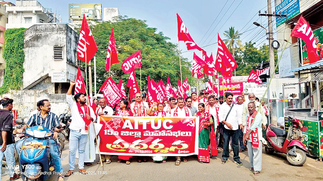 అరసవల్లి, డిసెంబరు 21(ఆంధ్రజ్యోతి): పోరాటాలతోనే హక్కులు రక్షించుకోవచ్చని ఏఐటీయూసీ రాష్ట్రఅధ్యక్షుడు ఆర్.రవీంద్రనాథ్ పిలుపునిచ్చారు.ఆదివారం శ్రీకాకుళంలోని డైమండ్ పార్కు నుంచి ఏడురోడ్ల కూడలి వద్ద గల ఎన్టీఆర్ మునిసిపల్ హైస్కూల్ వరకు ఏఐటీయూసీ జిల్లా 15వ మహాసభలు పురస్కరించుకుని ర్యాలీ నిర్వహించారు. ఈ సందర్భంగా ఆయన మాట్లాడుతూ ప్రస్తుతం దేశంలో కార్మిక వ్యతిరేక ప్రభుత్వాలు పరిపాలిస్తున్నాయన్నారు. శ్రీకాకుళం ఎమ్మెల్యే గొండు శంకర్ మాట్లాడుతూ ఉత్తమ పరిశ్రమల స్థాపనకు కార్మికుల సహకారం ఎంతో అవసరమని తెలిపారు. మహాసభలో రాష్ట్ర కార్యదర్శి పడాలరమణ, నాయకులు టి.తిరుపతిరావు, టి.ముత్యాలరావు, డి.కిరణ్, వై.సూర్యనారాయణ, బి.అప్పలరాజు, లబ్బరాజు, కె.అప్పలరాజు, సునీత పాల్గొన్నారు.