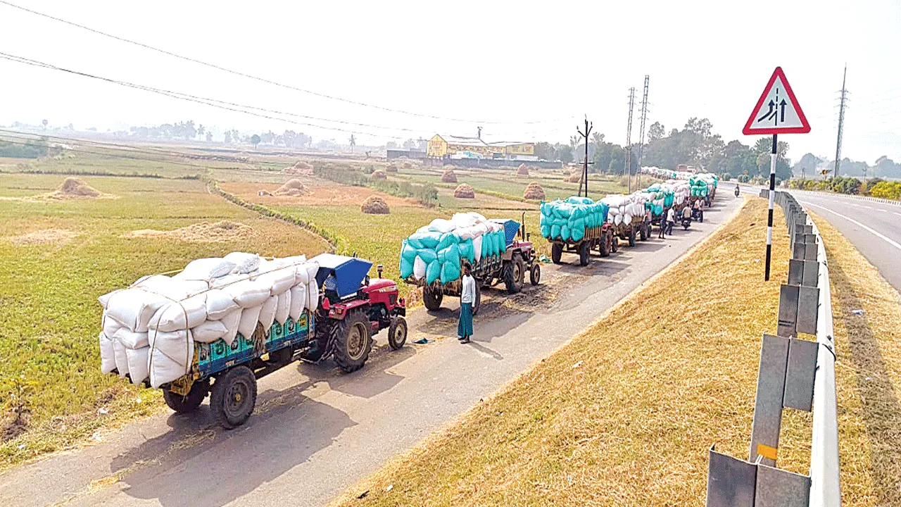 ధాన్యంతో ట్రాక్టర్లు బారులు