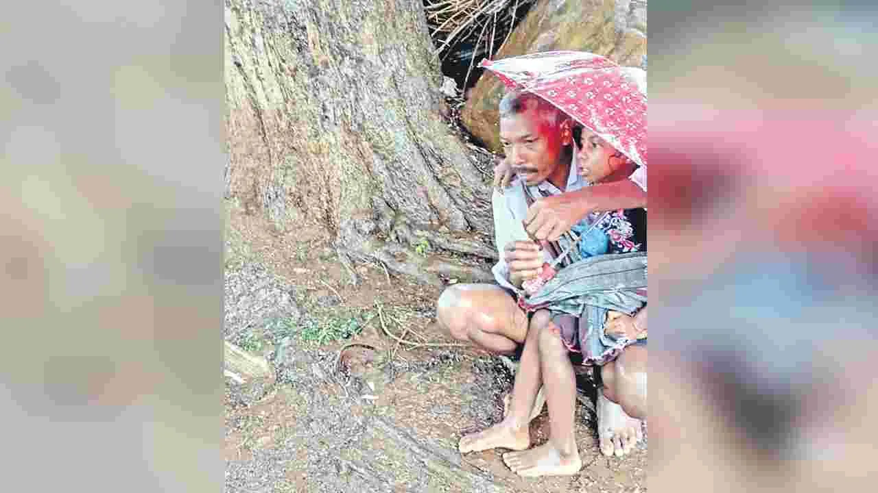 జోరువానలో చిన్నారిని ఎత్తుకుని నాలుగు కిలోమీటర్ల నడక