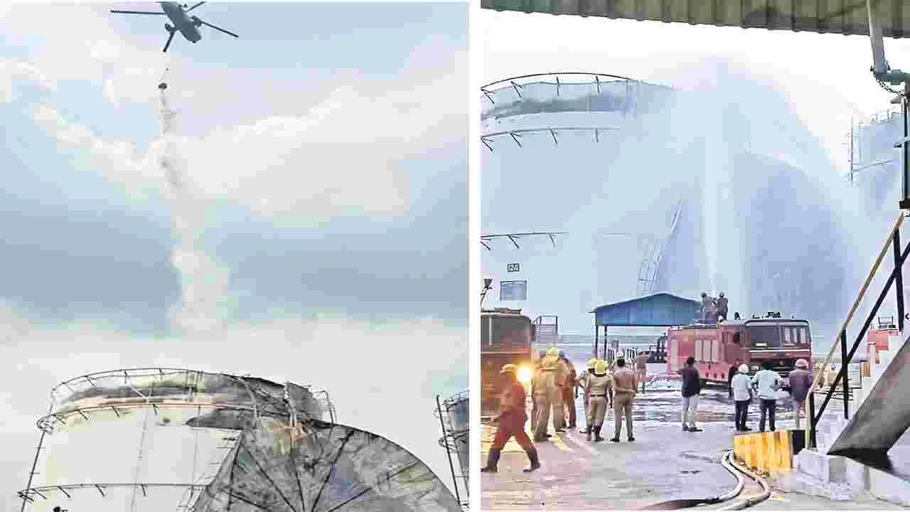 విశాఖపట్నం, సెప్టెంబరు 8 (ఆంధ్రజ్యోతి): ఈస్ట్ ఇండియా పెట్రోలియం లిమిటెడ్(ఈఐపీఎల్) కంపెనీలో మంటలు పూర్తిగా అదుపులోకి రాలేదు. ఆదివారం మధ్యాహ్నం మిథనాల్ ఆయిల్(పెట్రోలియం ఫిల్టరింగ్) ట్యాంకుపై పిడుగు పడటంతో మంటలు చెలరేగిన విషయం తెలిసిందే. ఆ ట్యాంక్ నుంచి సోమవారం రాత్రి వరకు మంటలు వస్తూనే ఉన్నాయి. తూర్పు నౌకాదళం అధికారులు ఐఎన్ఎస్ డేగా నుంచి సీ కింగ్ హెలికాప్టర్ను తీసుకువచ్చి, దాని ద్వారా ఫోమ్, నీటిని ట్యాంకుపై వెదజల్లి మంటలను అదుపులోకి తీసుకువచ్చే ప్రయత్నం చేస్తున్నారు. మంగళవారం ఉదయానికి మంటలు పూర్తిగా తగ్గిపోయే అవకాశం ఉందని అంచనా వేస్తున్నారు. ఈఐపీఎల్ కంపెనీ మిథనాల్ను ట్యాంకుల్లో నిల్వ చేస్తోంది. ప్రమాదానికి గురైన ట్యాంకు సామర్థ్యం 7,225 లీటర్లు. ప్రమాదం జరిగే సమయానికి అందులో 6,500 లీటర్ల మిథనాల్ ఉంది. దీనికి మండే గుణం అధికం. గాలి సోకినప్పుడు ఏ చిన్న ఇగ్నిషన్ (వేడి) తగిలినా వెంటనే అంటుకుంటుంది. మిథనాల్ నిల్వ చేసే ట్యాంకులు ప్రత్యేకంగా ఉంటాయి. ట్యాంకుపై పిడుగు పడినప్పుడు పైకప్పు విరిగి పక్కకు జారిపోవడంతోపాటు లోపల ఉన్న ఫ్లోటింగ్ రూఫ్కు ఒక అంగుళం మేర రంధ్రం ఏర్పడి మంట లోపలికి చేరింది. తద్వారా మిథనాల్ అంటుకుంది. మిగిలిన ఫ్లోటింగ్ రూఫ్ అంతా బాగానే ఉంది. ట్యాంకులోకి ఎంత నీరు పోసినా, ఫోమ్ వెదజల్లినా ఆ అంగుళం రంధ్రం నుంచే లోపలకు వెళ్లి మంటలను తగ్గిస్తున్నాయి.