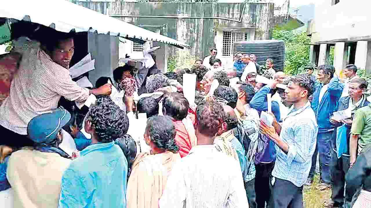 పెదబయలు, సెప్టెంబరు 4 (ఆంధ్రజ్యోతి): మండలంలోని అడుగులపుట్టు రైతు సేవా కేంద్రం వద్ద సబ్సిడీపై అందిస్తున్న రాజ్మా విత్తనాల కోసం గురువారం తోపులాట జరిగింది. రైతులు ఉదయాన్నే ఈ సేవా కేంద్రం వద్దకు చేరుకున్నారు. 90 శాతం సబ్సిడీపై అందిస్తున్న విత్తనాల కోసం సచివాలయం పరిధిలోని అడుగులపుట్టు, లక్ష్మీపేట పంచాయతీలకు చెందిన రైతులు ఒకేసారి రావడంతో రద్దీ నెలకొంది. వాస్తవానికి అడుగులపుట్టు సచివాలయానికి నాలుగు టన్నుల విత్తనాలు కేటాయించగా అవి సరిపోలేదు. దీంతో మరో అరటన్ను కేటాయించారు. అయితే ఒక పట్టాలో ఎన్ని ఎకరాల భూమి ఉన్నా కేవలం 10 కిలోలు మాత్రమే విత్తనాలు అందించడంపై రైతులు ఆవేదన వ్యక్తం చేశారు. వాస్తవానికి ఒక్కో రైతు ఎకరం నుంచి సుమారు ఐదు ఎకరాల వరకు సాగు చేస్తున్నారు. అయితే ప్రభుత్వం ఇచ్చే విత్తనాలు తమకు సరిపోవడం లేదని వారు వాపోతున్నారు. సబ్సిడీ విత్తనాలు సరిపోవేమోనని భావనతో రైతులు సేవా కేంద్రం వద్ద తోసుకోవడంతో కొంత ఉద్రిక్తత నెలకొంది. దీనిపై మండల వ్యవసాయ అధికారి సునీల్ వివరణ కోరగా, సీతగుంట పరిధిలో మూడు టన్నులు, అడుగులపుట్టు సచివాలయం పరిధిలో నాలుగు టన్నుల చొప్పున విత్తనాలు కేటాయించామన్నారు. అయితే రైతులు అధికంగా రావడంతో అడుగులపుట్టు సచివాలయానికి మరో అరటన్ను కేటాయించినట్టు ఆయన తెలిపారు. మండల వ్యాప్తంగా రెండు వేల ఎకరాలకు ఈ-క్రాప్ నమోదైందని, అయితే 50 టన్నులు మాత్రమే మండలానికి కేటాయింపులు జరిగినట్టు ఆయన చెప్పారు. వీటిని రైతులకు సర్దుబాటు చేస్తున్నామని తెలిపారు.