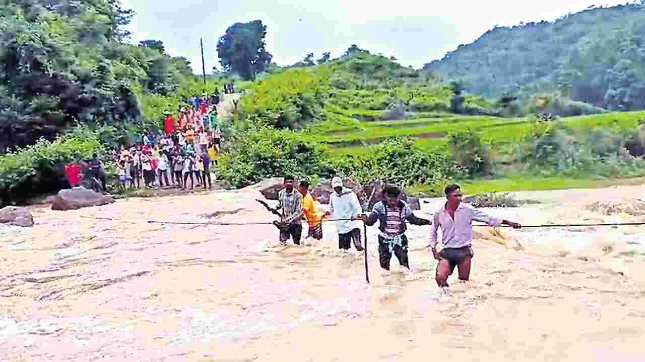 ఉధృతంగా ప్రవహిస్తున్న గెడ్డ దాటిన గిరిజనులు