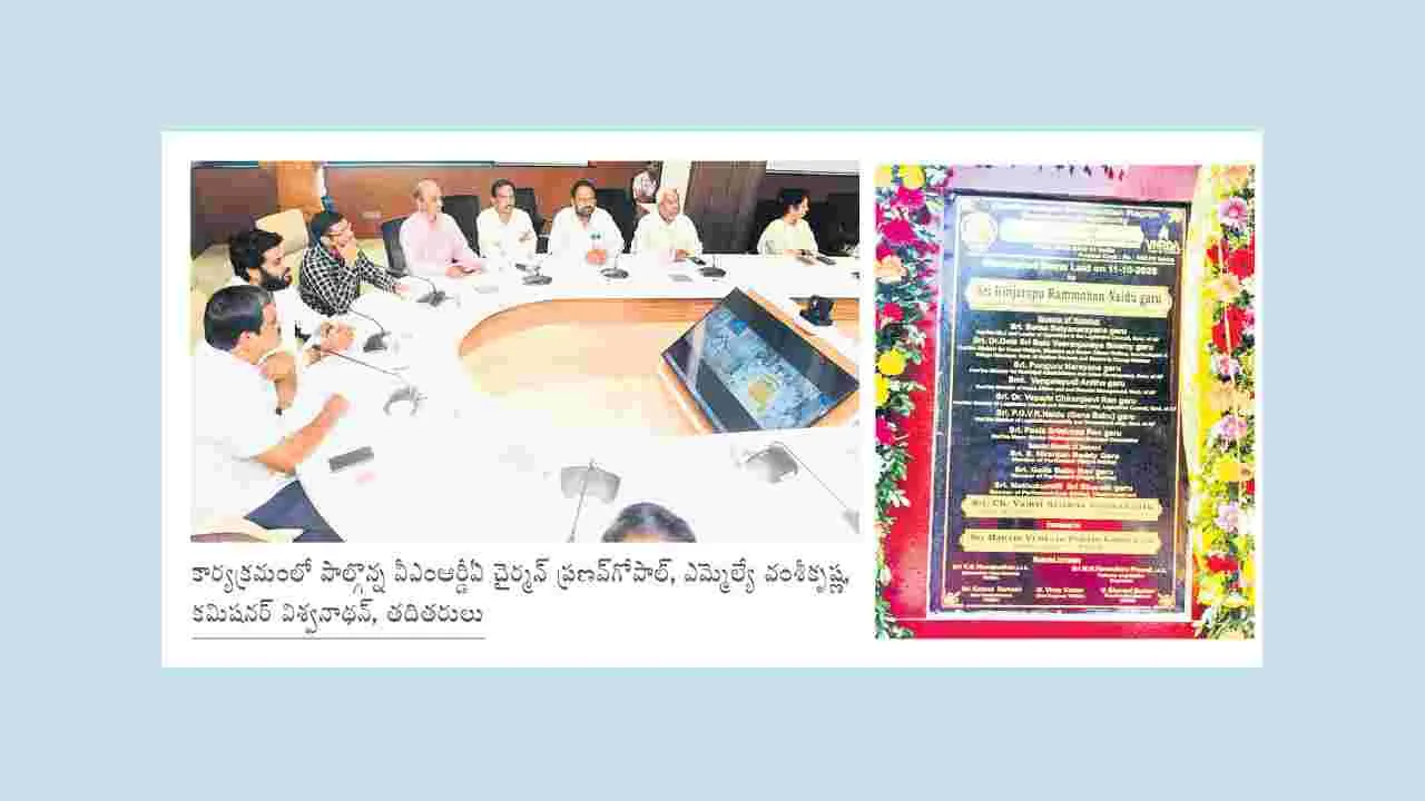 వీఎంఆర్డీఏ సిటీ సెంట్రల్ పార్కులో రూ.3.5 కోట్లతో యాంటీ డ్రగ్ గ్లో థీమ్ పార్కు ఏర్పాటుకు కేంద్ర పౌర విమానయాన శాఖా మంత్రి కె.రామ్మోహన్నాయుడు శనివారం వర్చువల్గా శంకుస్థాపన చేశారు. కార్యక్రమాన్ని వీఎంఆర్డీఏ కార్యాలయం నుంచి చైర్మన్ ప్రణవ్గోపాల్, ఎమ్మెల్యే వంశీకృష్ణ శ్రీనివాస్, కమిషనర్ విశ్వనాథన్ తదితరులు పర్యవేక్షించారు. ఈ సందర్భంగా కేంద్ర మంత్రి మాట్లాడుతూ యువత తప్పుడు మార్గంలో వెళ్లకుండా వినూత్నమైన యోచనతో ఈ థీమ్ పార్క్ నిర్మించడం మంచి ఆలోచన అని, ఇది విశాఖలో ప్రత్యేకంగా ఉంటుందన్నారు. అలాగే భోగాపురం విమానాశ్రయం ప్రారంభమయ్యే నాటికి వీఎంఆర్డీఏ చేపట్టిన మాస్టర్ ప్లాన్ రహదారులు అందుబాటులోకి వచ్చేలా చూడాలని సూచించారు. వీఎంఆర్డీఏ చైర్మన్ ప్రణవ్గోపాల్ మాట్లాడుతూ యాంటీ డ్రగ్ పార్కు అనేది ప్రపంచంలో ఇదే మొదటిదన్నారు. కార్యక్రమంలో జాయింట్ కమిషనర్ కె.రమేశ్, సెక్రటరీ మురళీకృష్ణ, చీఫ్ ఇంజనీర్ వినయ్కుమార్, ఎస్ఈలు భవానీశంకర్, మధుసూదనరావు, సీయూపీ శిల్ప, డీఎఫ్వో సుజన శివానీ, తదితరులు పాల్గొన్నారు.