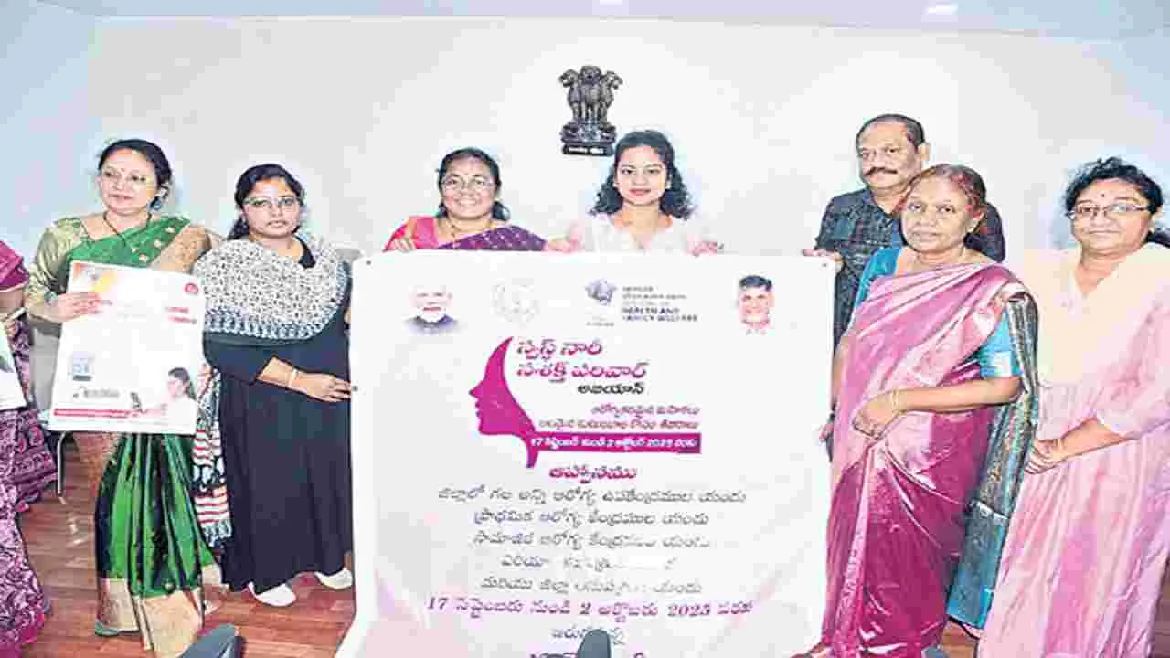 మహిళల ఆరోగ్య పరిరక్షణకు స్వస్థ్ నారీ సశక్త్ పరివార్ అభియాన్ కార్యక్రమం ఎంతో దోహదం చేస్తుందని జాయింట్ కలెక్టర్ ఎం.జాహ్నవి అన్నారు. ఈ కార్యక్రమానికి సంబంధించిన ప్రచార ఫ్లెక్సీని, పోస్టర్లను మంగళవారం తన చాంబర్లో ఆవిష్కరించారు. ఈ సందర్భంగా జేసీ మాట్లాడుతూ, బుధవారం జిల్లాలోని 46 కేంద్రాల్లో ఈ కార్యక్రమం ప్రారంభం అవుతుందని,, అక్టోబరు రెండో తేదీ వరకు ఆరోగ్య శిబిరాలు నిర్వహిస్తామని తెలిపారు. ఈ శిబిరాల్లో వివిధ రకాల స్ర్కీనింగ్ పరీక్షలు నిర్వహించి అవసరమైన వారికి తగిన వైద్య సదుపాయాన్ని అందించాలని వైద్య, ఆరోగ్య శాఖ అధికారులను ఆదేశించారు. వ్యాధులను ముందుగా గుర్తించి అవసరమైన ఆరోగ్య సేవలను అందించడమే ఈ కార్యక్రమం ముఖ్యఉద్దేశమన్నారు.