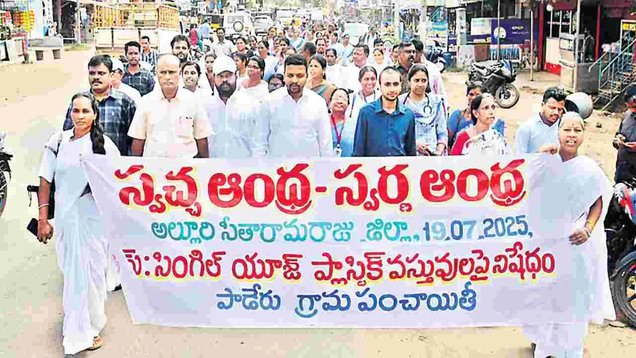 పాడేరు, జూలై 19(ఆంధ్రజ్యోతి): ప్లాస్టిక్ కాలుష్య నియంత్రణ అందరి బాధ్యతని ఐటీడీఏ ఇన్చార్జి పీవో, జాయింట్ కలెక్టర్ డాక్టర్ ఎంజే.అభిషేక్గౌడ అన్నారు. స్థానిక ఐటీడీఏ కార్యాలయం నుంచి అంబేడ్కర్ కూడలి వరకు స్వచ్ఛాంధ్ర-స్వర్ణాంధ్ర ర్యాలీని ఆయన ప్రారంభించారు. ఈ సందర్భంగా మాట్లాడుతూ.. పర్యావరణానికి హానికరమైన సింగిల్ యూజ్ ప్లాస్టిక్ని పూర్తిగా నిషేధించాలన్నారు. వారపు సంతలు, పర్యాటక ప్రదేశాల్లో వాటర్ బాటిల్ వినియోగాన్ని నియంత్రించాలని, ప్లాస్టిక్ వినియోగంతో జల వనరుల కాలుష్యం పెరుగుతుందన్నారు. పంచాయతీ కార్యదర్శులు, గ్రామ రెవెన్యూ అధికారులు క్షేత్ర స్థాయిలో ప్లాస్టిక్ నిషేధానికి పటిష్టమైన చర్యలు చేపట్టాలన్నారు. ప్లాస్టిక్ వినియోగంతో కలిగే నష్టాలపై ప్రజల్లో చైతన్యం తీసుకురావాలని ఆయన పిలుపునిచ్చారు. అసిస్టెంట్ కలెక్టర్ నాగ వెంకట్ సాహిత్ మాట్లాడూతూ.. ప్లాస్టిక్ వినియోగం పర్యావరణానికి హాని చేస్తుందన్నారు. భూమిలో ప్లాస్టిక్ 400 ఏళ్లు పాటు ఉంటుందన్నారు. అనంతరం స్థానిక ప్రభుత్వ జూనియర్ కళాశాల మైదానంలో స్వచ్ఛాంధ్ర-స్వర్ణాంధ్ర మానవహారం నిర్వహించారు. కార్యక్రమంలో జిల్లా వైద్యారోగ్యశాఖాధికారి డాక్టర్ టి.విశ్వేశ్వరనాయుడు, గ్రామ సచివాలయాల జిల్లా నోడల్ అధికారి పీఎస్.కుమార్, వైద్యులు, సిబ్బంది, విద్యార్థులు పాల్గొన్నారు.