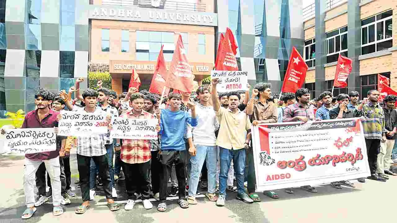 విశాఖపట్నం, ఆగస్టు 23 (ఆంధ్రజ్యోతి): డిగ్రీ విద్యార్థుల సమస్యలను పరిష్కరించాలని కోరుతూ ఆల్ ఇండియా డెమోక్రటిక్ స్టూడెంట్స్ ఆర్గనైజేషన్ (ఏఐడీఎస్వో) ఆధ్వర్యంలో శనివారం ఏయూ వీసీ కార్యాలయం ఎదుట ఆందోళన చేశారు. డిగ్రీ విద్యార్థులు ఎదుర్కొంటున్న సమస్యలను పరిష్కరించాలన్న డిమాండ్తో ఏఐడీఎస్వో ఆధ్వర్యంలో చలో ఆంధ్రా యూనివర్సిటీకి పిలుపునివ్వగా, పెద్ద సంఖ్యలో విద్యార్థులు పాల్గొని ర్యాలీగా వీసీ కార్యాలయం వద్దకు చేరుకున్నారు. ఈ సందర్భంగా విద్యార్థి సంఘాల ప్రతినిధులు మాట్లాడుతూ రాష్ట్రవ్యాప్తంగా డిగ్రీ కళాశాలల్లో నెలకొన్న సమస్యలను పరిష్కరించాలని, సింగిల్ మేజర్ సబ్జెక్టు విధానాన్ని తొలగించాలని, మూడు సబ్జెక్టుల కాంబినేషన్ను పునఃప్రవేశపెట్టాలని, సీఎస్పీ, ఇంటర్న్షిప్లను తొలగించాలని, ఫీజు రీయింబర్స్మెంట్ బకాయిలను తక్షణమే విడుదల చేయాలని డిమాండ్ చేశారు. ఏఐడీఎస్వో అధ్యక్షుడు కె.అభిలాశ్ మాట్లాడుతూ సింగిల్ మేజర్ సబ్జెక్ట్ విధానం వల్ల విద్యార్థులు తాము ఎంచుకుంటున్న సబ్జెక్టుపై సమగ్ర జ్ఞానాన్ని కోల్పోతున్నారన్నారు. డిగ్రీ విద్యకు అవసరమైన ఇతర అనుబంధ సబ్జెక్టులను తొలగించడం వల్ల విద్యార్థులు పరిమితమైన జ్ఞానంతో మిగిలిపోతున్నారని పేర్కొన్నారు. కార్యక్రమంలో ఏఐడీఎస్వో ఉపాధ్యక్షుడు బి.సంతోశ్, సభ్యులు చరణ్, సిద్ధు, సంతోష్, తదితరులు పాల్గొన్నారు.